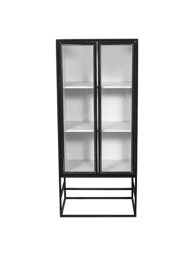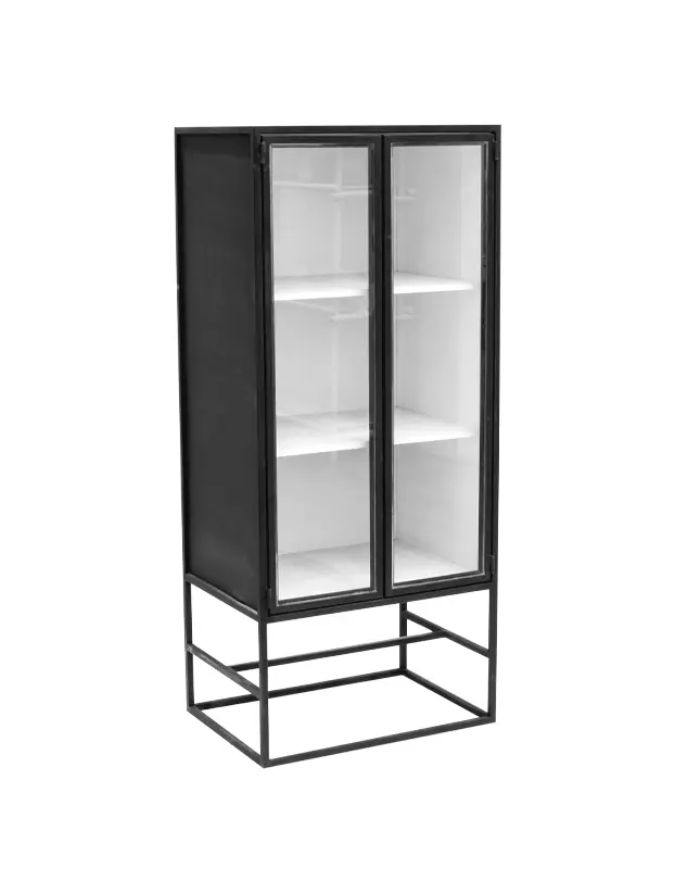 Este mueble es una vitrina alta con estructura de metal negro y puertas de vidrio, ideal para renta en eventos o exhibiciones. Su diseño moderno y minimalista con estantes internos permite mostrar artículos de forma organizada y elegante. Es perfecto para realzar objetos decorativos, vajillas, o incluso plantas, ofreciendo una apariencia limpia y sofisticada. Su estructura elevada y sus puertas transparentes le dan un toque de amplitud y luminosidad, adecuado para complementar decoraciones en estilos contemporáneos e industriales.