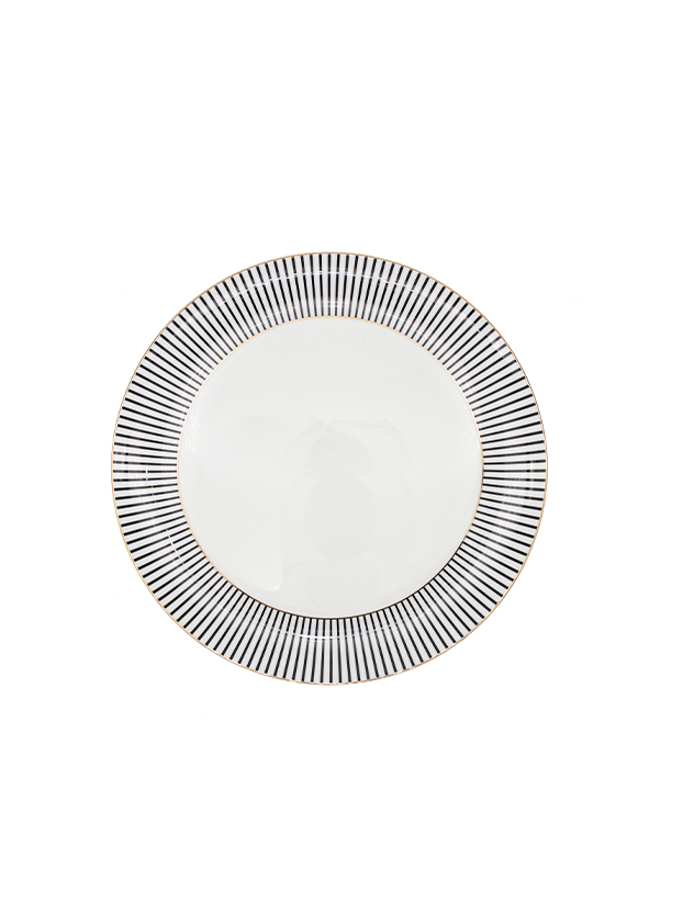Este elegante plato de porcelana, con borde de líneas negras radiales y sutil contorno dorado, es perfecto para ocasiones especiales. Su diseño sofisticado y centro blanco realzan cualquier presentación de alimentos, ideal para bodas, cenas formales y eventos corporativos, aportando un toque de distinción y modernidad a la mesa.