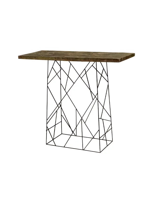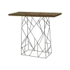 Mesa periquera con tablero de madera y base metálica en diseño geométrico, ideal para renta en eventos que buscan un estilo moderno y artístico. Su estructura de líneas entrelazadas aporta un toque vanguardista, mientras que el acabado en madera natural agrega calidez y contraste. Esta mesa es perfecta para áreas de socialización o estaciones de bar en eventos contemporáneos, ofreciendo una combinación única de funcionalidad y diseño innovador.