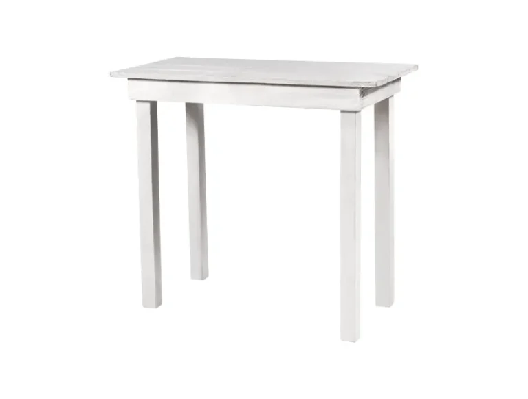 Mesa periquera blanca de estilo rústico con un diseño sencillo y elegante, ideal para renta en eventos que buscan un ambiente campestre y acogedor. Su acabado en blanco envejecido le aporta un toque vintage, perfecto para áreas de socialización o estaciones de bar en decoraciones shabby chic o bohemias. Esta mesa es una opción versátil y funcional que se adapta a eventos de estilo relajado y con encanto.