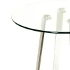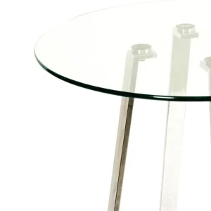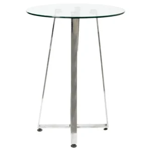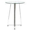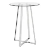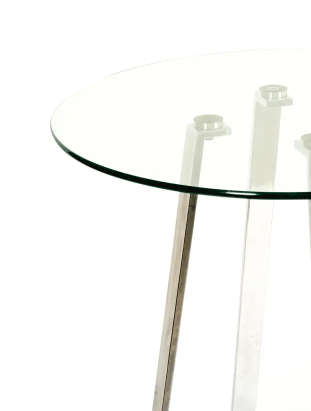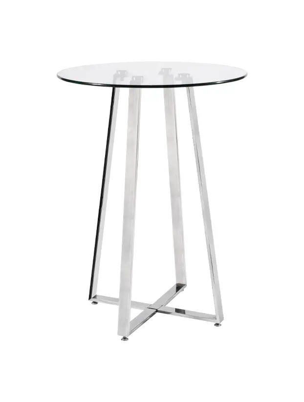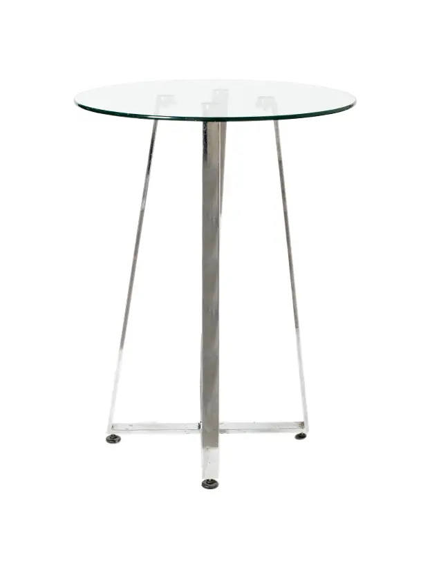 Mesa periquera con cubierta de cristal y base de metal cromado en forma de pirámide invertida, ideal para renta en eventos de estilo moderno y elegante. Su diseño minimalista y materiales sofisticados la convierten en una pieza perfecta para áreas de socialización o estaciones de bar en eventos que buscan una decoración contemporánea y luminosa. Esta mesa aporta un toque de distinción y estilo a cualquier ambiente.