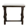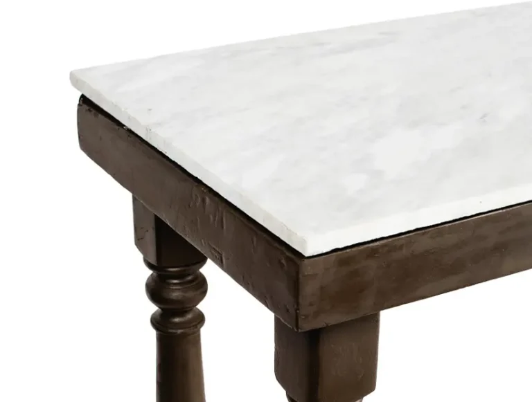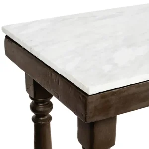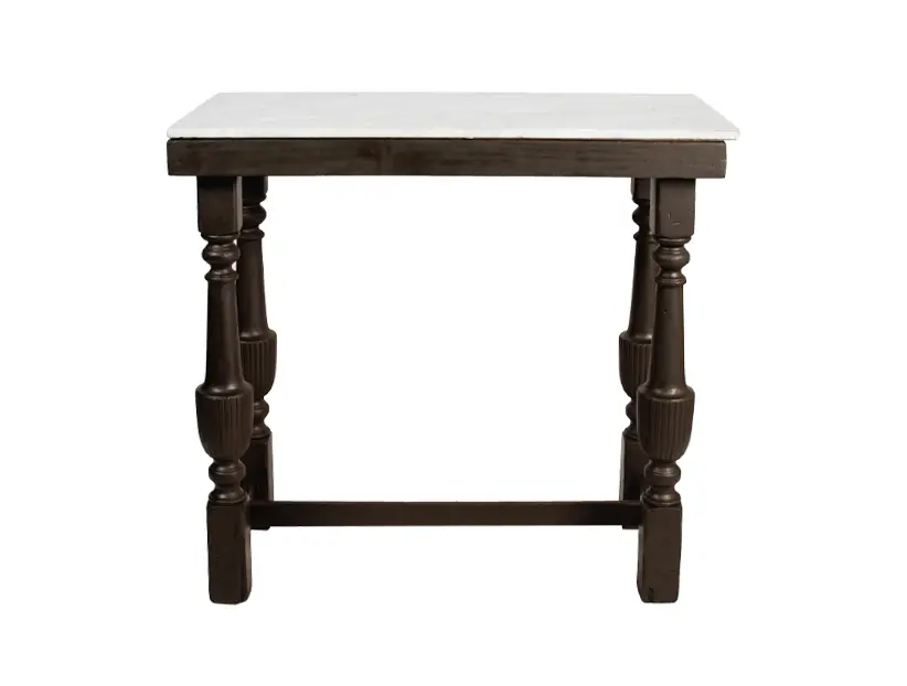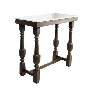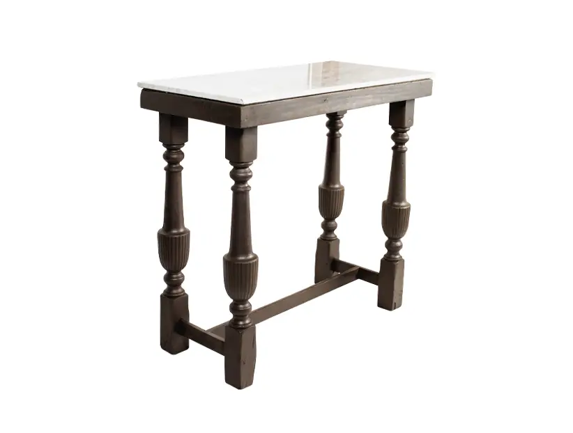 Mesa alta rectangular de madera oscura con cubierta de mármol y patas torneadas, estilo rústico clásico.
