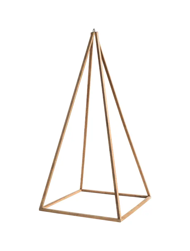 Esta pirámide colgante de madera es una pieza decorativa que combina un diseño geométrico con un toque natural y cálido. Su estructura abierta y triangular permite usarla como base para decoraciones colgantes, como luces, arreglos florales o elementos decorativos, agregando un estilo bohemio o rústico a cualquier evento. El acabado en madera le da un aspecto acogedor, ideal para bodas, eventos al aire libre o temáticas naturales. Su versatilidad y simplicidad la convierten en un elemento atractivo que realza el ambiente sin sobrecargarlo, aportando un toque de elegancia y naturalidad al espacio.