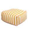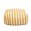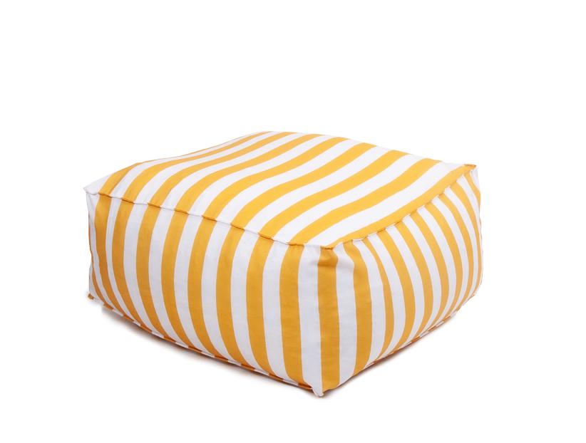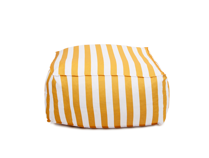 Este puff presenta un diseño atractivo con rayas verticales en color amarillo y blanco, que le dan un estilo fresco y moderno; su forma es suave y acolchonada, lo que transmite comodidad y lo hace ideal como asiento auxiliar o reposapiés, mientras que su combinación de colores aporta un toque vibrante y veraniego, perfecto para complementar espacios relajados tanto en interiores como en exteriores cubiertos.