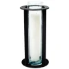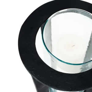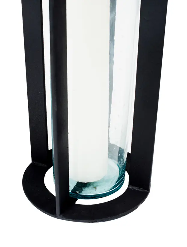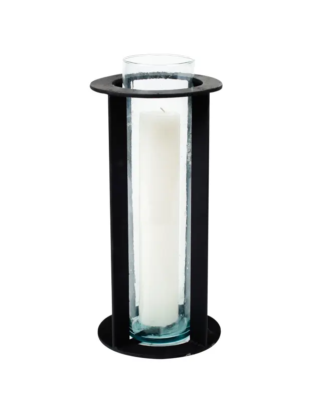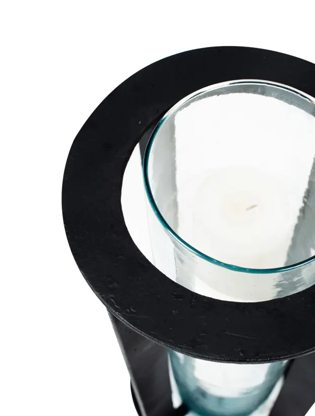 Este quinqué de diseño circular combina una estructura metálica en color negro con un cilindro de vidrio en su interior, ideal para sostener una vela y crear una iluminación tenue y elegante. Su base de concreto le proporciona estabilidad y un toque industrial, mientras que el formato vertical y la estructura abierta permiten que la luz se distribuya de manera uniforme. Este quinqué es perfecto para ambientaciones modernas o industriales, y aporta un elemento decorativo sofisticado y funcional para eventos o espacios interiores que buscan un estilo contemporáneo y minimalista.