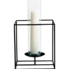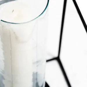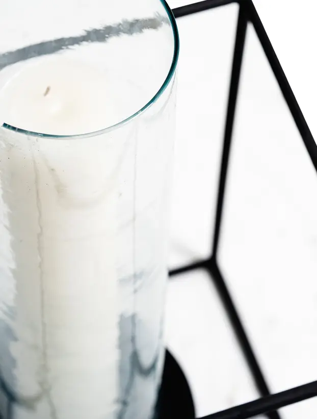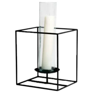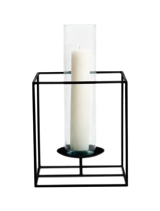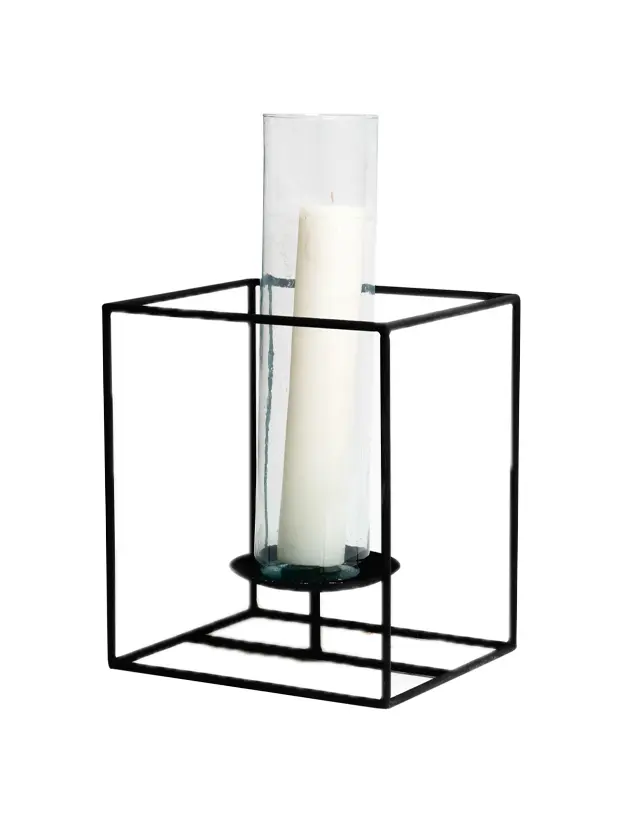 Este quinqué cúbico presenta un diseño moderno y minimalista, compuesto por una estructura metálica en forma de cubo que enmarca un cilindro de vidrio en el centro, donde se coloca una vela. Su acabado en color negro y líneas simples lo hacen ideal para decoraciones contemporáneas e industriales, aportando un toque de elegancia y sobriedad. El contraste entre la estructura metálica y el vidrio permite que la luz de la vela se disperse de manera suave, creando una atmósfera acogedora y sofisticada. Perfecto para ambientaciones en eventos o decoraciones en interiores con un estilo moderno.