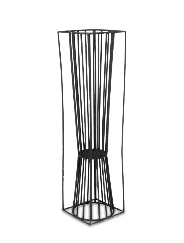 Este quinqué modelo «Punta Mita» tiene una estructura alta y estilizada, fabricada en metal con un diseño abierto de barras verticales que le da un toque moderno e industrial. Su forma cónica invertida se estrecha hacia la base y se ensancha en la parte superior, creando un atractivo visual ligero y elegante. En el centro, cuenta con una pequeña base donde se puede colocar una vela, ideal para iluminar y decorar espacios interiores y exteriores. Este quinqué es perfecto para quienes buscan un accesorio decorativo contemporáneo y funcional.