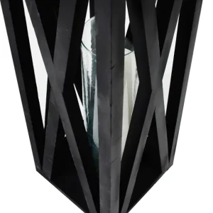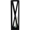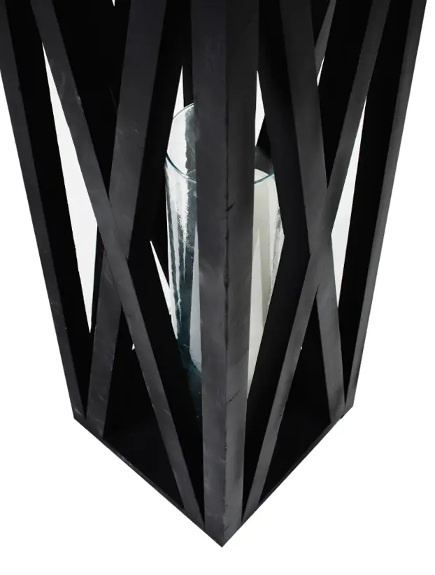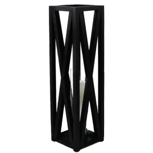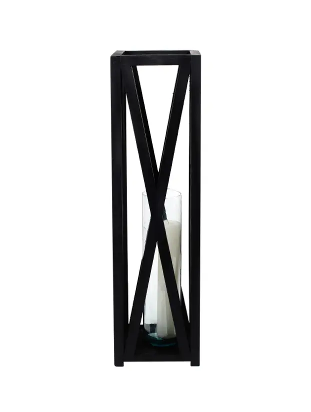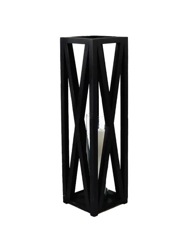 Este quinqué de diseño rústico cuenta con una estructura de madera en color negro, con detalles en forma de «X» en sus laterales que añaden un toque decorativo distintivo. En su interior, un cilindro de vidrio permite colocar una vela, proyectando una luz cálida y acogedora a través de su marco. Este estilo es perfecto para ambientaciones modernas con un toque campestre o industrial, y es ideal para eventos al aire libre o en interiores que buscan una atmósfera cálida y elegante. La estructura en madera lo convierte en un elemento decorativo resistente y atractivo.