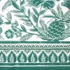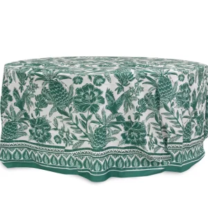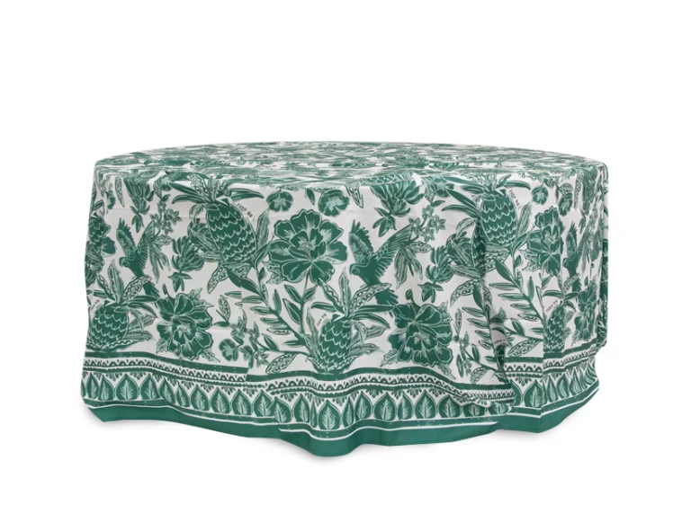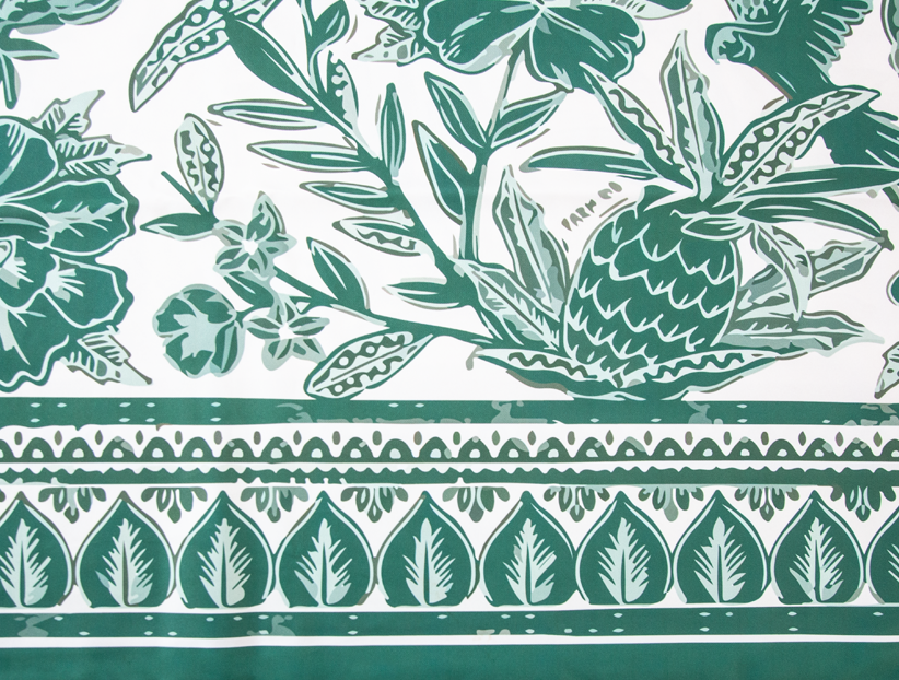 Este mantel destaca por su diseño tropical en tonos verde y blanco, con motivos de piñas, hojas y flores que evocan frescura y naturaleza. La cenefa decorativa en la orilla añade un detalle elegante que lo convierte en una pieza ideal para eventos al aire libre, celebraciones temáticas o montajes que busquen un estilo vibrante y natural, aportando un toque sofisticado y llamativo a la mesa.