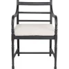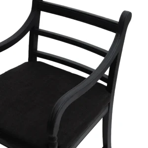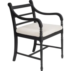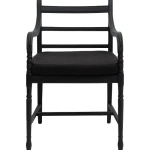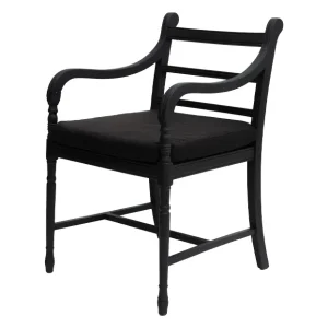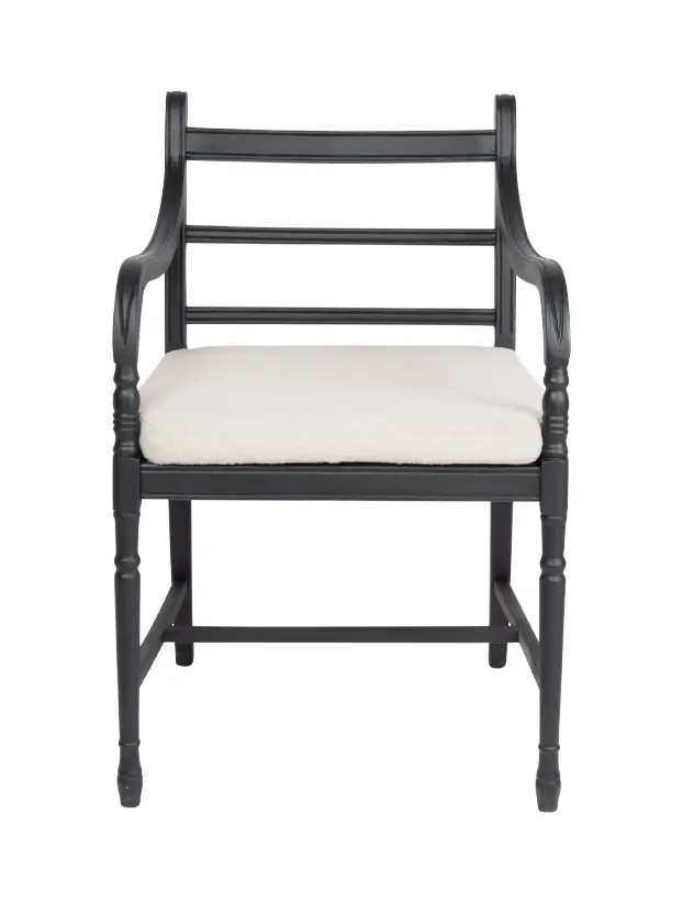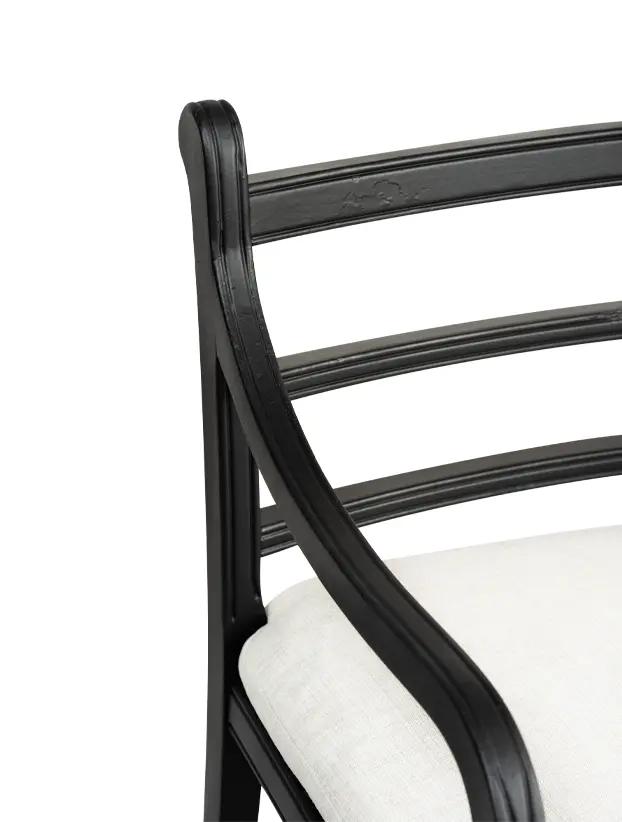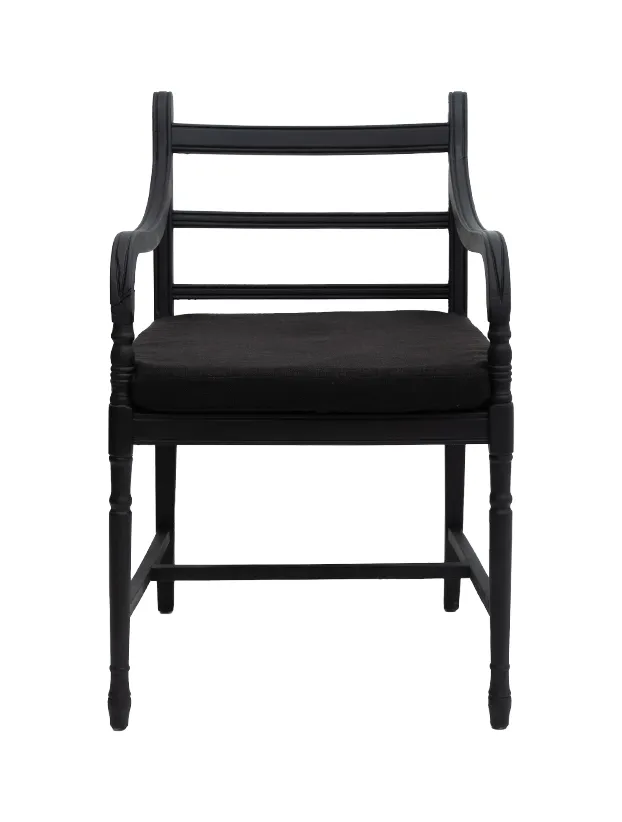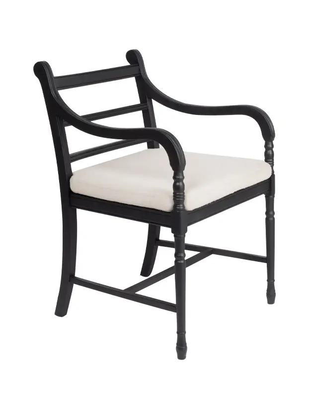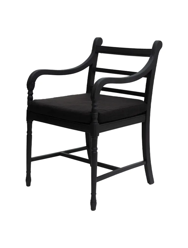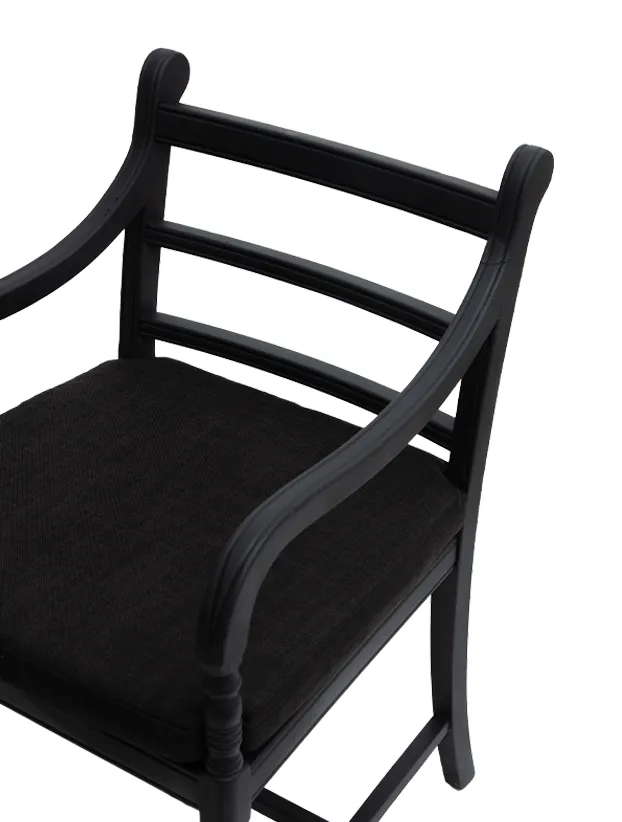 Silla con estructura de madera en tono negro, con detalles torneados en las patas delanteras y curvas en los brazos lo que le dan un aspecto refinado y artesanal. El respaldo tiene un diselo abierto con barras horizontales que aporta ligereza visual. El asiento cuenta con cojin en color ivory que agrega comodidad. Esta silla es perfecto para eventos formales con toque elegante y tradicional.