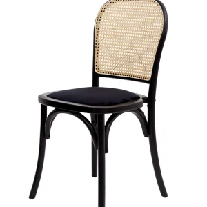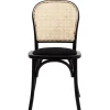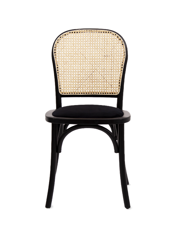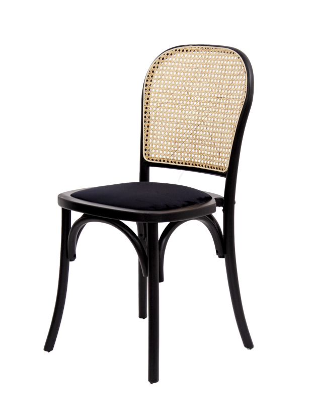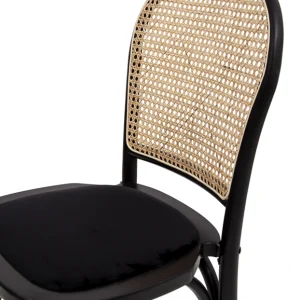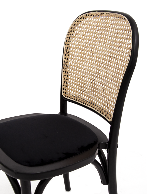 Silla de diseño clásico con estructura de madera en color negro, asiento tapizado en tela oscura y respaldo de rejilla de mimbre natural, que combina elegancia y comodidad, ideal para comedores, cafés o espacios de estilo vintage y contemporáneo.
