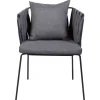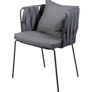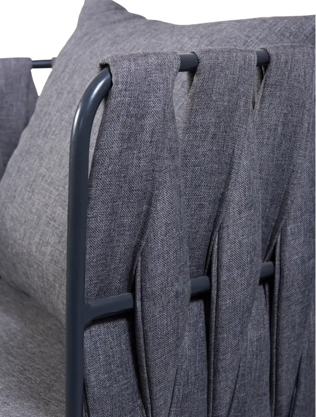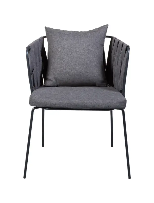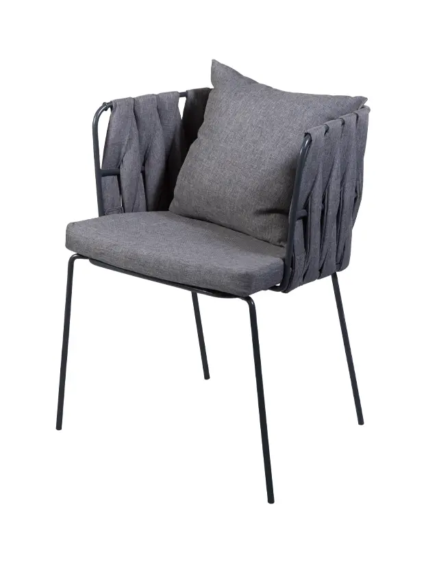 Silla con estructura de acero patas delgadas y rectadas en acabo gris oxford generando un aspecto minimalista. Los laterales y el respaldo llevan un tejido redondo con tela en colorgris oxford que aporta textura y estilo. Incluye un cojin de asiento y otro en respaldo, ambos en el mismo tono ofreciendo una sensacion de confort. Esta silla presenta un diseño contemporaneo y elegante, ideal para eventos modernos o con toque sofisticado.