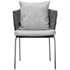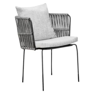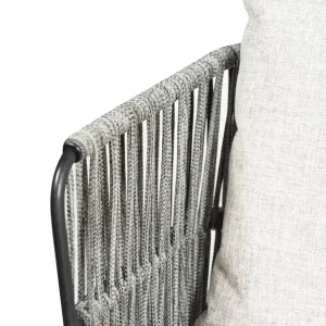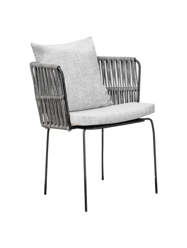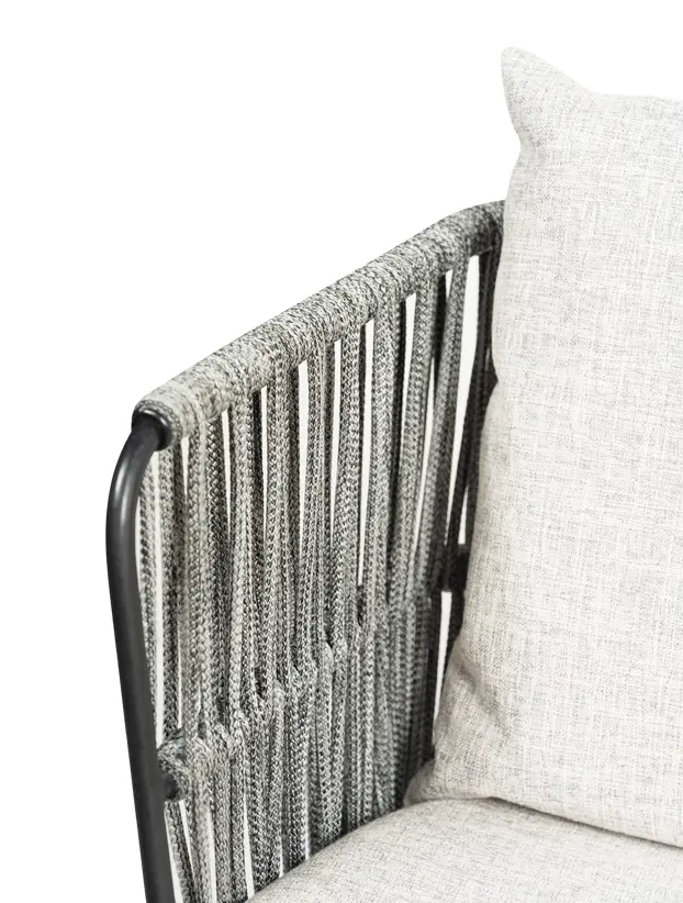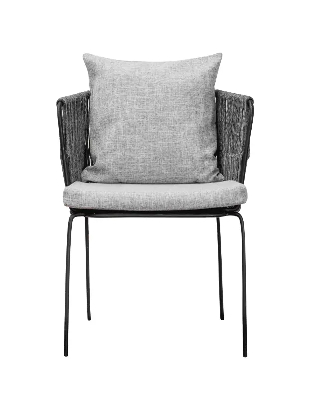 Silla con estructura de acero en color obscuro y los brazos de tejido redondo le otorgan un asoecto contemporaneo y sobrio, ideal para ambientes elegante. Los cojines alcochonados en tonos grises brindad comodidad y un toque de calidez, complementando su estilo. Perfecta para quienes buscan una mezcla de funcionalidad y estetica refinada, esta silla es ideal para bodas, evento corporativos y reuniones que requieren un mobiliario de calidad y buen gusto.