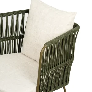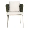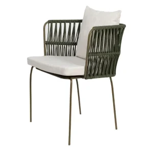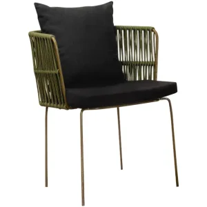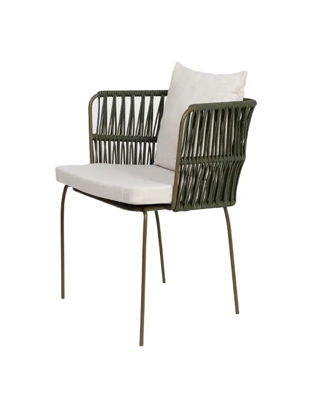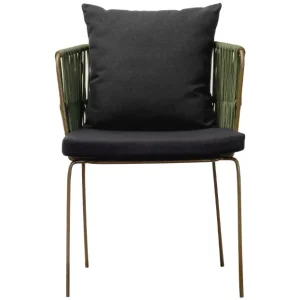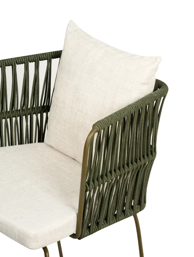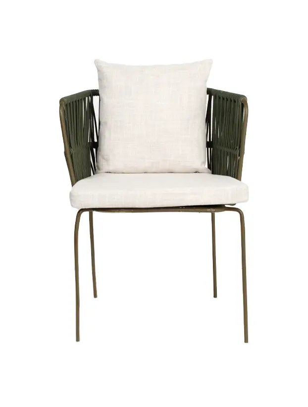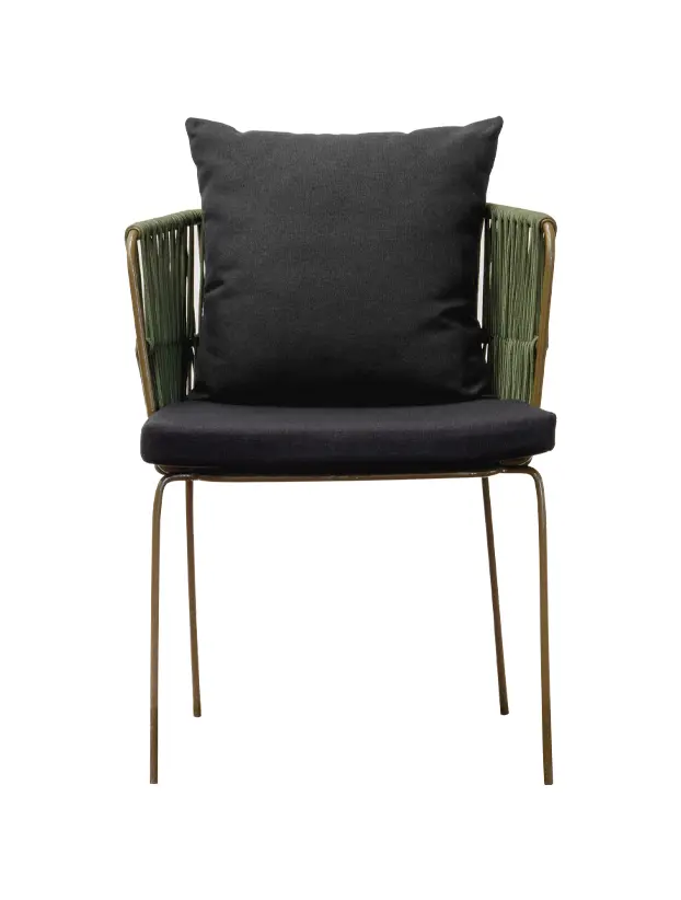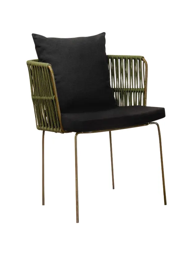 Silla con estructura de acero en color verde olivo y los brazos te tejido redondo del mismo color aportando un toque orgánico y fresco. Los cojines en color negro ofrecen un contraste elegante y destacan su diseño sofisticado, brindando comodidad sin sacrificar estilo. Perfecta para ambientaciones en exteriores o interiores con temática bohemia, rústica o industrial, esta silla es una opción versátil y atractiva para eventos como bodas, reuniones al aire libre y celebraciones de estilo casual pero refinado.