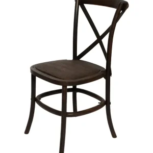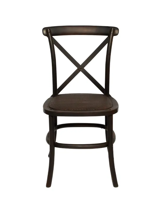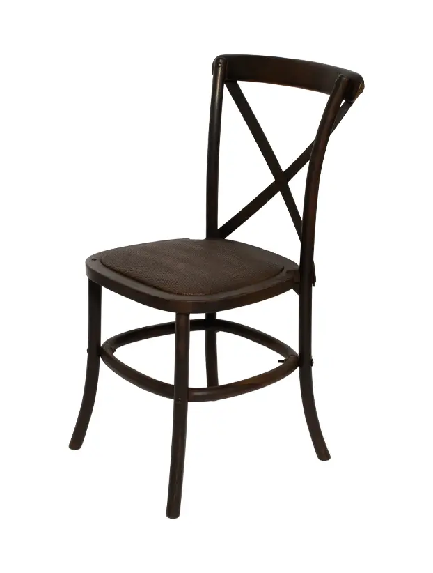 Silla con estructura de madera oscura y su característico respaldo en forma de “X” le otorgan un diseño tradicional y elegante, ideal para ambientaciones campestres, bodas al aire libre o celebraciones en interiores de estilo industrial o shabby chic. Su asiento de mimbre tejido agrega un toque artesanal y comodidad, haciendo de esta silla una opción cálida y funcional para eventos donde se desea combinar estética clásica con confort.