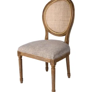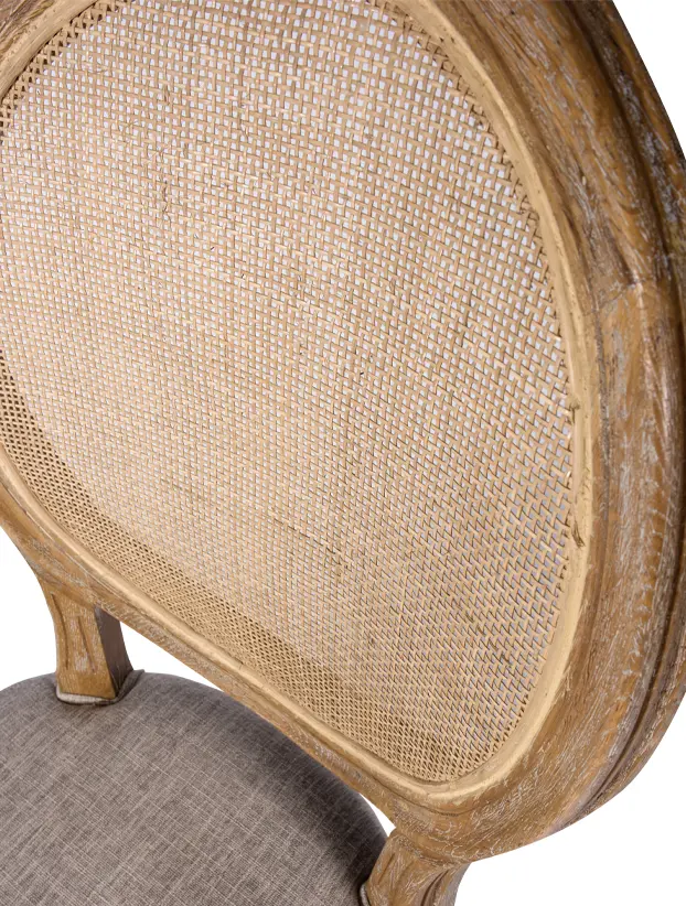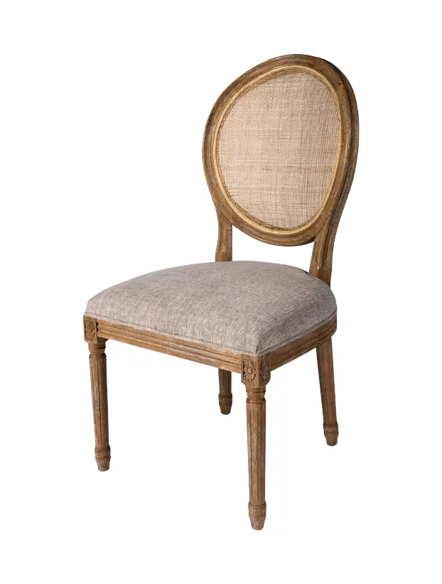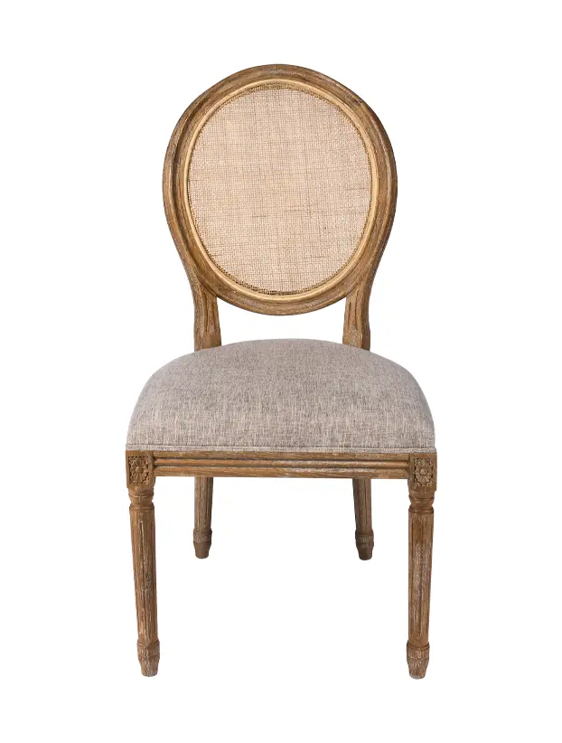Esta silla estilo francés es una opción elegante y clásica para renta en eventos sofisticados y refinados. Su estructura de madera tallada con detalles en las patas y respaldo circular en tejido de bejuco natural le confiere un toque vintage y distinguido. El asiento tapizado en tela gris claro complementa su diseño atemporal, brindando comodidad y estilo. Ideal para bodas, cenas formales y eventos que buscan un mobiliario de alta calidad y estética europea, esta silla es perfecta para crear una atmósfera de elegancia y encanto en cualquier espacio.