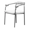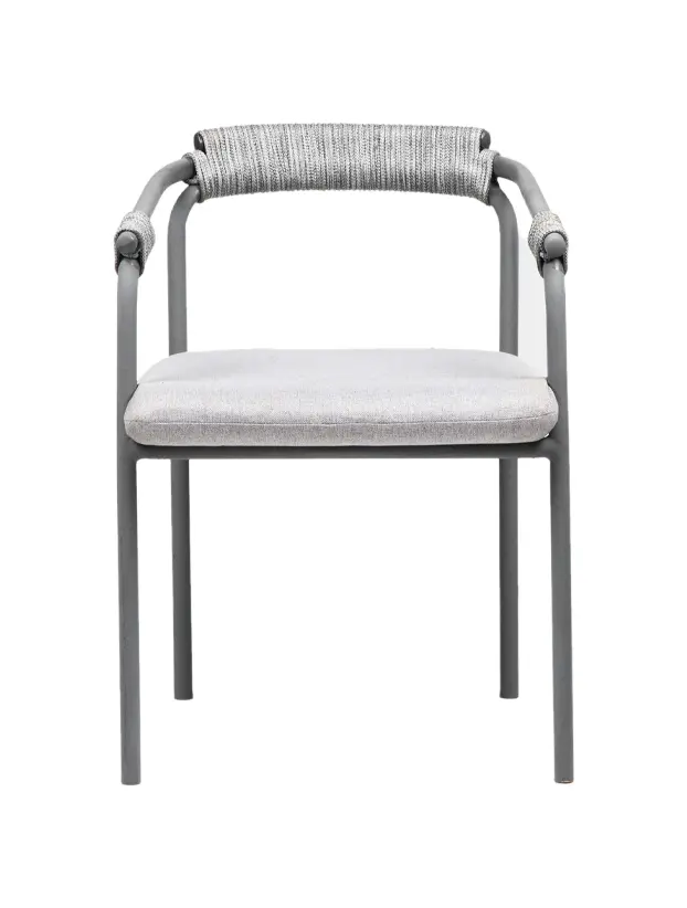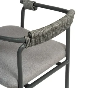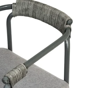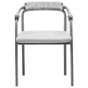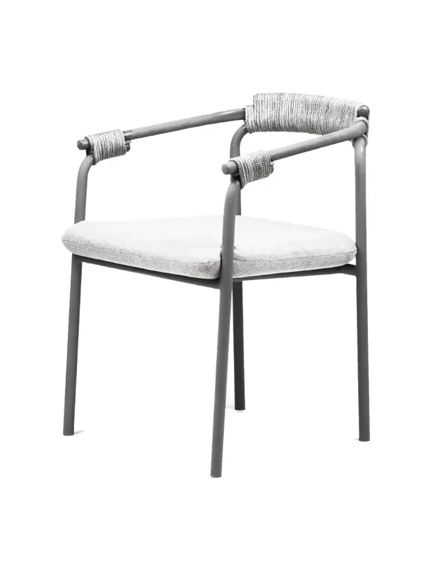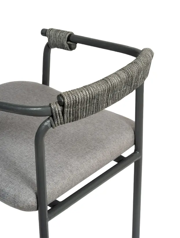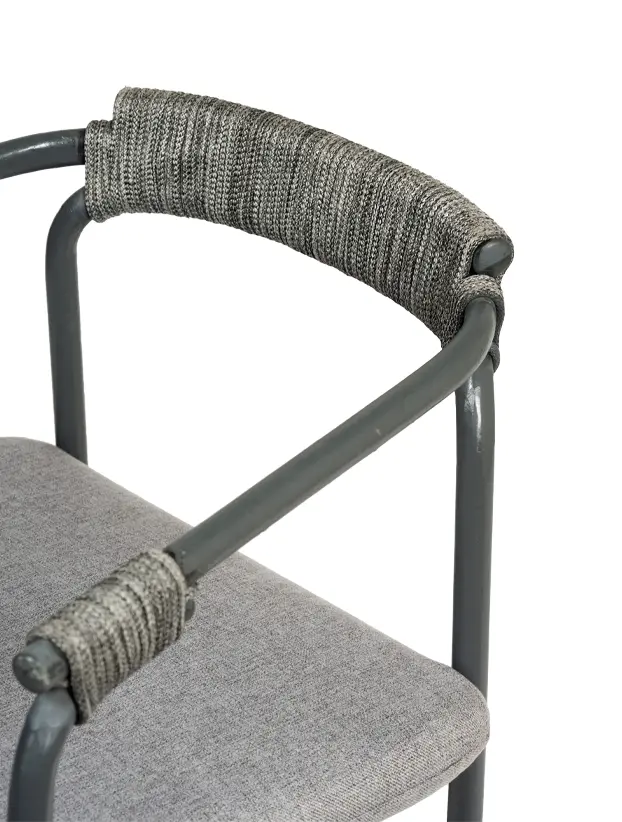 Esta silla de diseño moderno cuenta con una estructura de metal en color gris oscuro, ideal para eventos que buscan una estética contemporánea y funcional. Los detalles de cuerda en el respaldo y los apoyabrazos añaden un toque artesanal, creando un contraste interesante con la estructura metálica. El asiento acolchado en gris claro proporciona comodidad y estilo, haciéndola perfecta para espacios interiores y exteriores. Esta silla es una excelente opción para bodas, eventos corporativos y reuniones elegantes, aportando una combinación de confort, modernidad y sofisticación discreta.