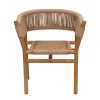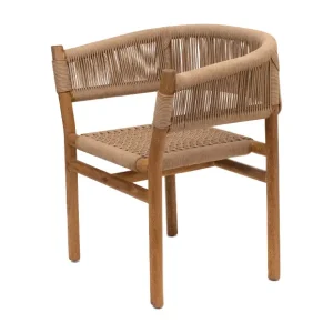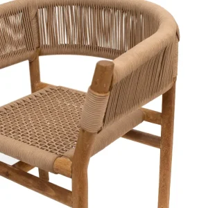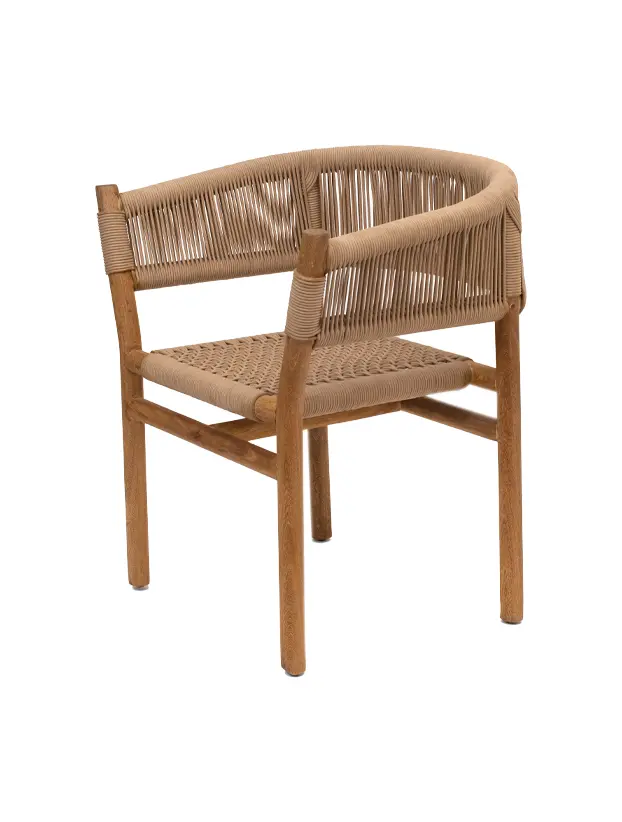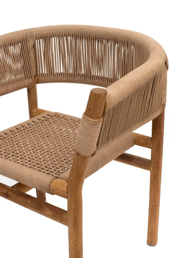 Esta silla de madera combina un diseño artesanal con un estilo contemporáneo. Su estructura de madera natural ofrece un acabado cálido y rústico, mientras que el asiento y respaldo están elaborados con un tejido de cuerda en tono neutro, proporcionando comodidad y un aspecto ligero. El respaldo curvado y los reposabrazos integrados brindan un soporte ergonómico, ideal para eventos elegantes y relajados. Perfecta para bodas, cenas al aire libre o interiores con un toque natural y sofisticado.