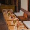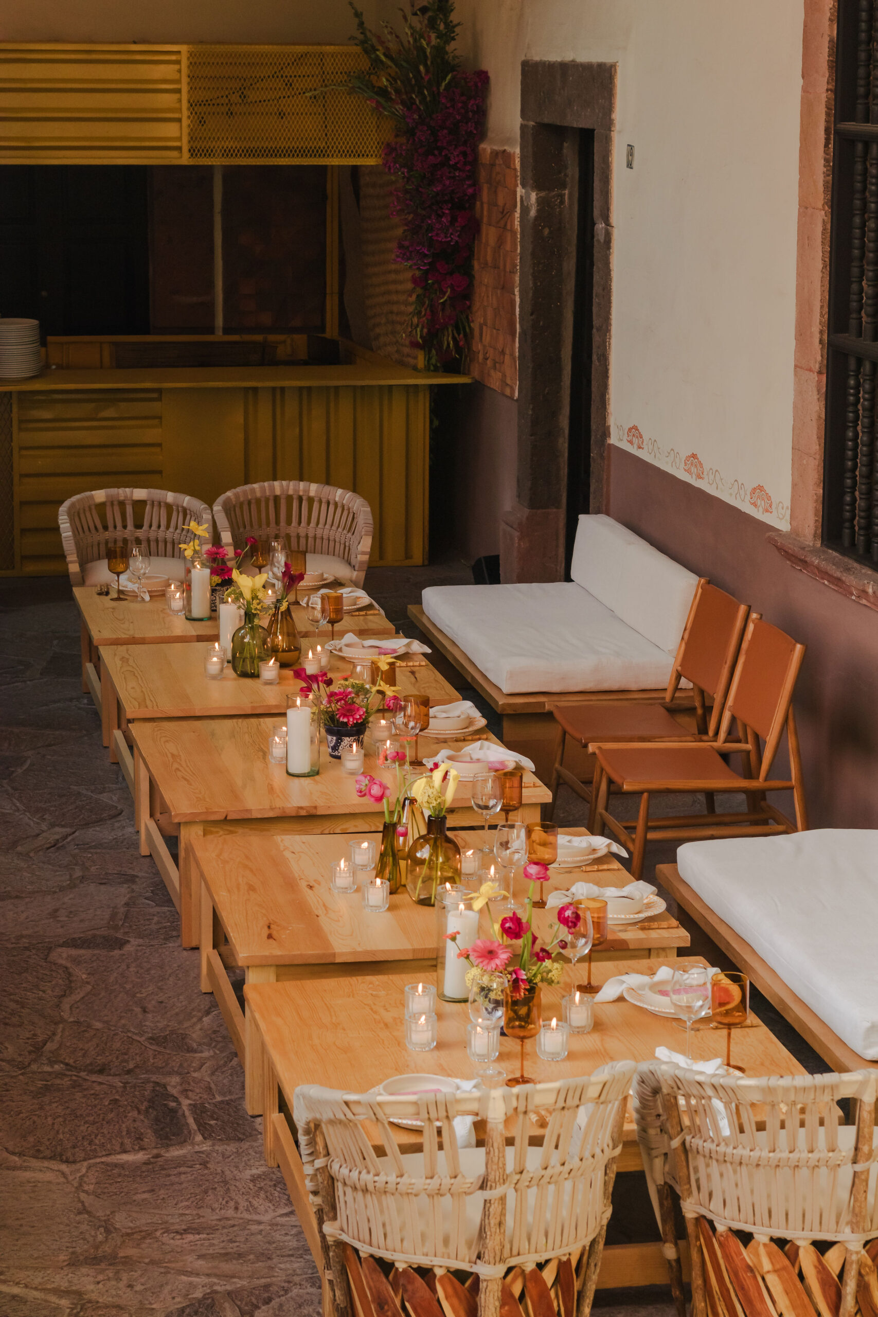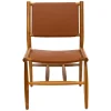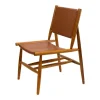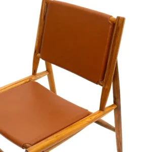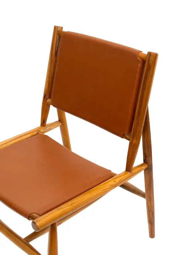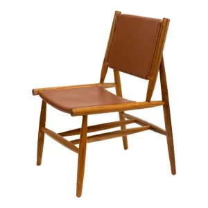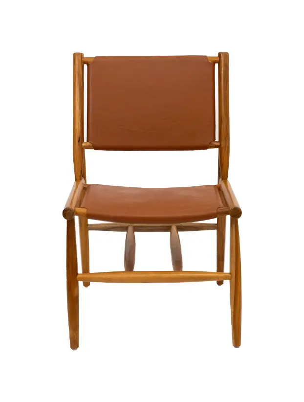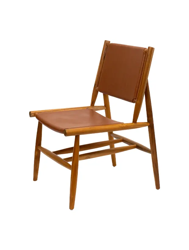 Esta silla tiene una estructura de madera con un diseño rústico pero elegante. El asiento y el respaldo están hechos de cuero en tono marrón, proporcionando un toque sofisticado y cómodo. Su forma y materiales la hacen ideal para espacios de estilo vintage, rústico o incluso moderno con un aire natural.