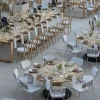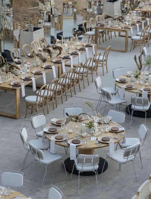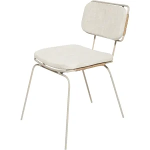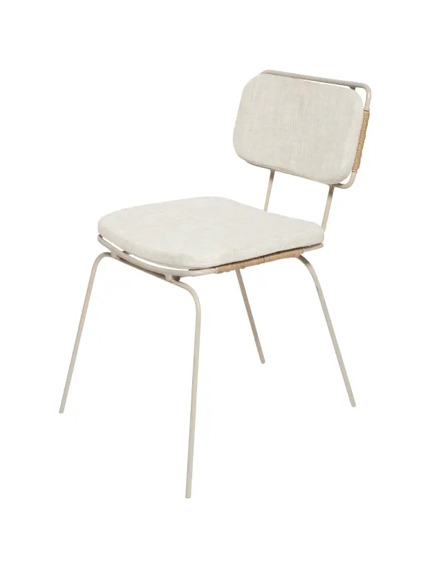 Esta silla de diseño moderno presenta una estructura metálica ligera en color claro, con asiento y respaldo acolchados en tono beige, lo que aporta comodidad y un estilo minimalista. La combinación de su estructura delgada y líneas limpias con el suave tapizado crea un contraste elegante, ideal para ambientes contemporáneos. Perfecta para eventos en interiores o exteriores, como bodas, reuniones o celebraciones de estilo escandinavo o boho-chic, esta silla ofrece un toque de sofisticación y simplicidad que se adapta bien a diversos estilos decorativos.