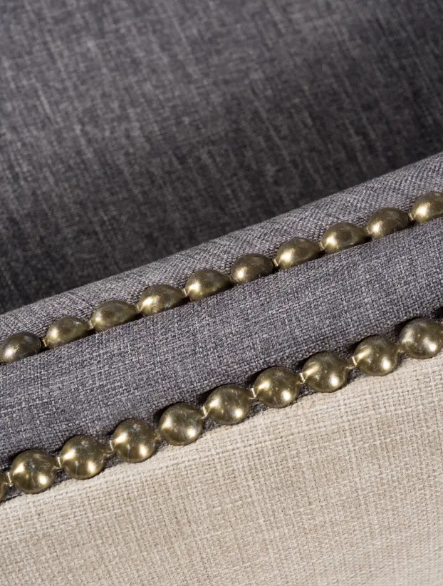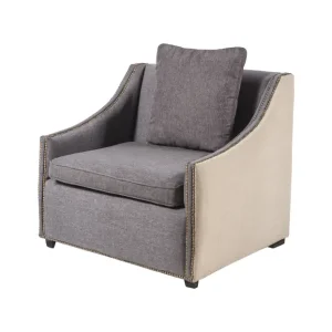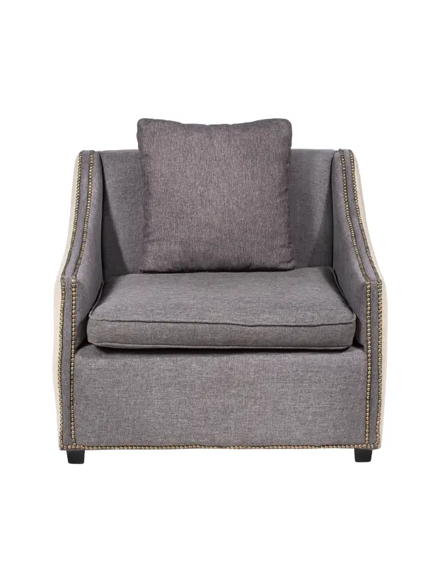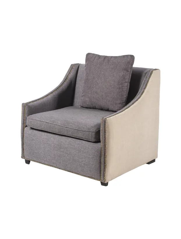 Este es un elegante sillón de diseño bicolor, combinando un tono gris oscuro en el asiento y respaldo con laterales en color beige claro. Su estilo clásico y moderno a la vez se complementa con detalles de tachuelas en los bordes, agregando un toque de sofisticación y carácter. El respaldo acolchonado y el cojín adicional ofrecen una comodidad extra, ideal para eventos donde se busque crear un ambiente acogedor y refinado. Su estructura robusta y el contraste de colores permiten que sea una pieza versátil, perfecta para eventos tanto formales como informales.