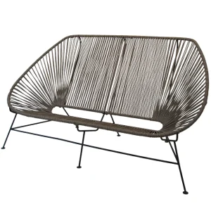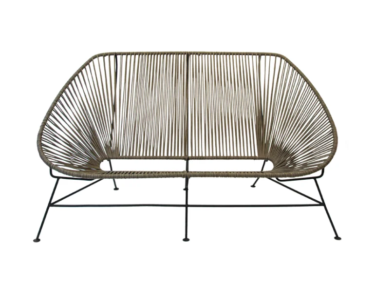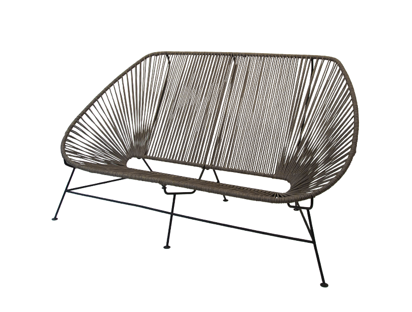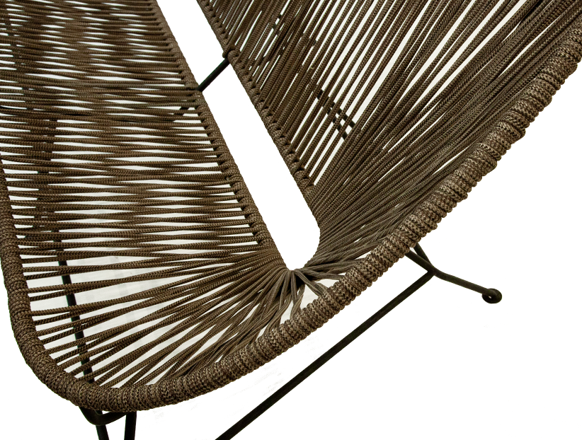 Este es un sillón estilo bohemio/moderno con un diseño de cuerda tejida en color cafe sobre una estructura de metal en acabado negro. La forma abierta y las líneas geométricas del respaldo le dan un toque fresco y estilizado, ideal para espacios al aire libre o interiores modernos. Es una excelente opción para eventos que buscan un ambiente relajado y acogedor, al mismo tiempo que añade un toque de sofisticación y estilo. Su estructura de metal proporciona estabilidad, mientras que el tejido ofrece comodidad y ventilación, perfecto para largas conversaciones o momentos de descanso en eventos sociales