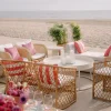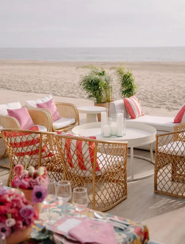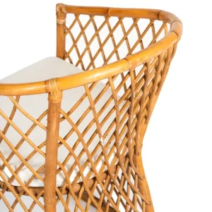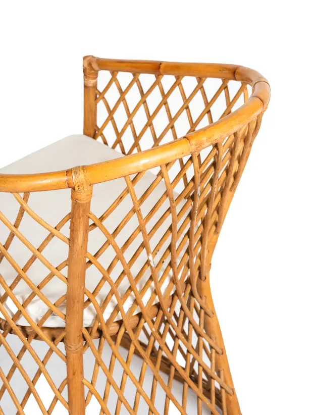 Este sillón de ratán en tono natural es ideal para eventos con una estética bohemia, tropical o rústica. Su diseño de malla entrecruzada y estructura redondeada le da un aire ligero y acogedor, perfecto para crear ambientes relajados y naturales. El asiento acolchado en color blanco proporciona comodidad y un contraste elegante con el ratán. Este sillón es perfecto para zonas lounge en bodas, eventos al aire libre o decoraciones casuales, añadiendo un toque de frescura y naturalidad al espacio, mientras invita a los invitados a relajarse y disfrutar del ambiente.