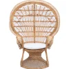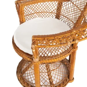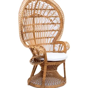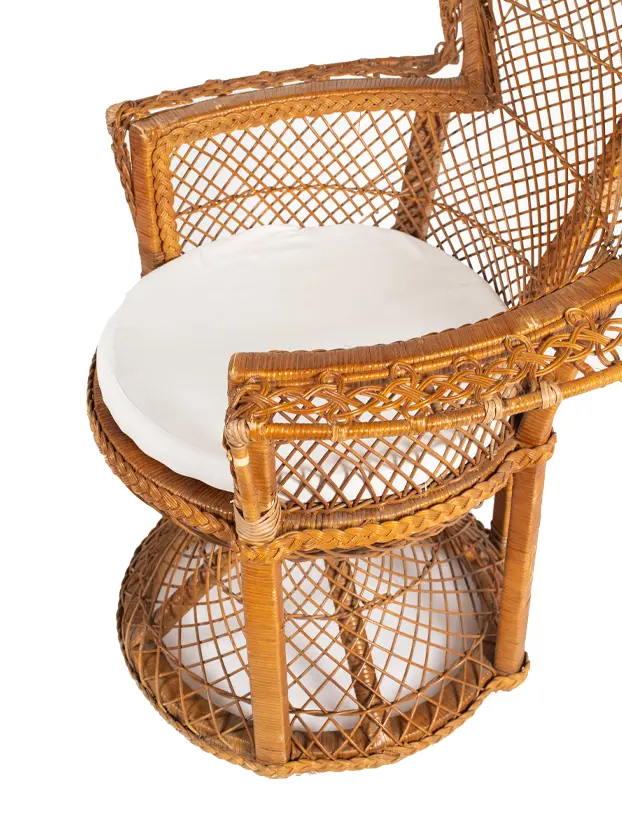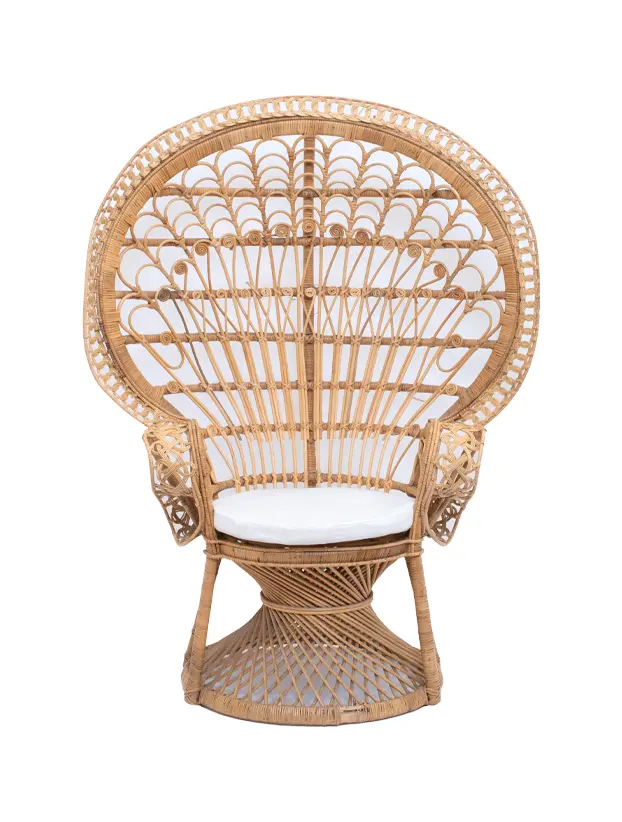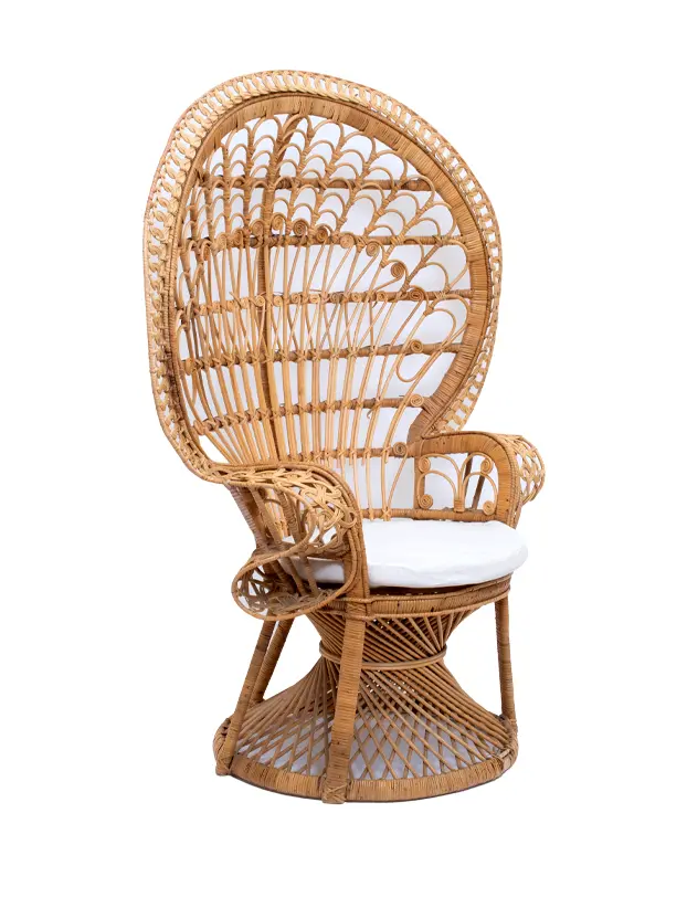 Este sillón pavorreal es una pieza icónica y llamativa, ideal para eventos que buscan un toque bohemio y elegante. Fabricado en ratán natural, presenta un respaldo alto en forma de abanico, elaborado con intrincados detalles entrelazados que le dan un aspecto artístico y majestuoso. El asiento está acolchado en color claro, proporcionando comodidad sin restar protagonismo a su diseño. Este sillón es perfecto para zonas lounge, áreas de fotos o como asiento destacado en bodas y eventos al aire libre. Su diseño único y ornamental añade un aire exótico y sofisticado, convirtiéndose en una pieza central que realza cualquier ambiente.