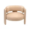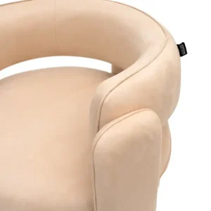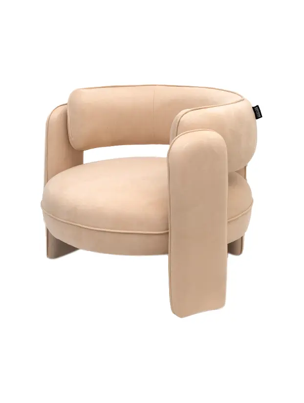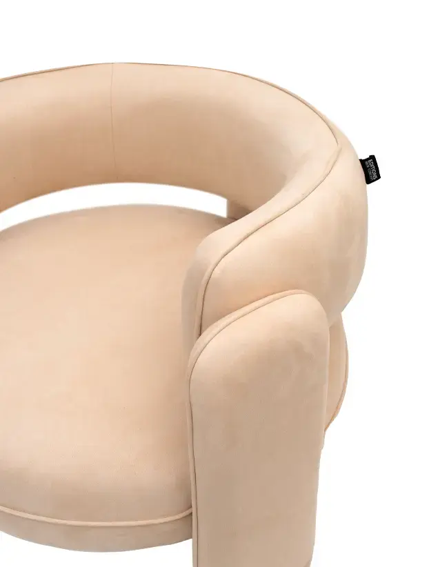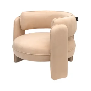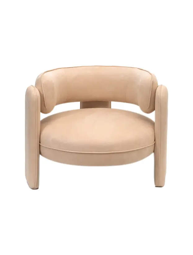 Este sillón de diseño contemporáneo con una estructura redondeada y tapizado en un tono crema. Su respaldo curvo y acolchonado envuelve el asiento circular, proporcionando comodidad y un estilo sofisticado. Los apoyabrazos altos y acolchados complementan su diseño elegante, haciéndola ideal para espacios modernos y minimalistas.