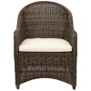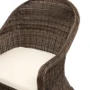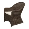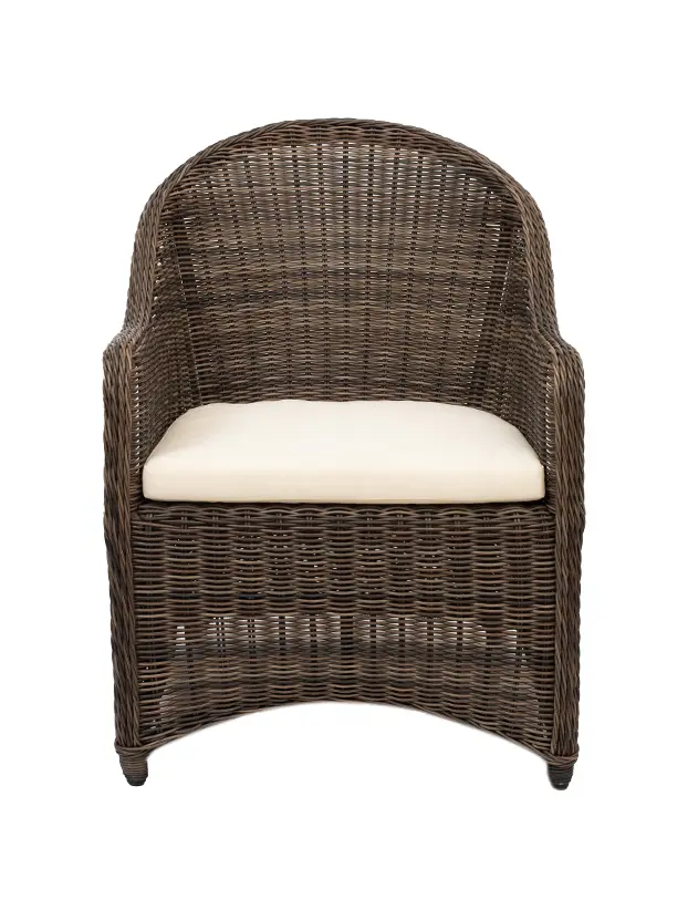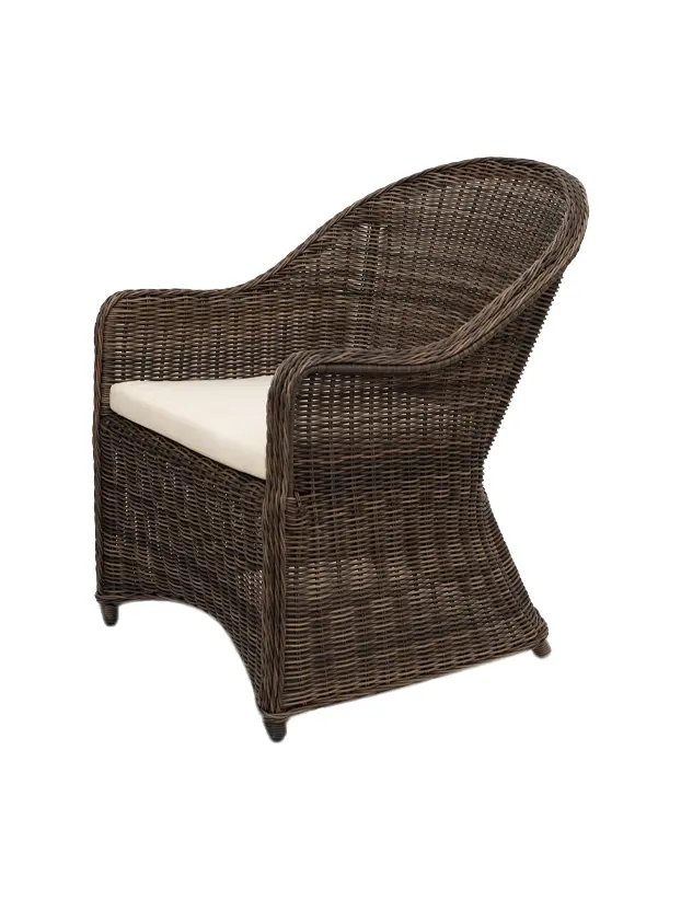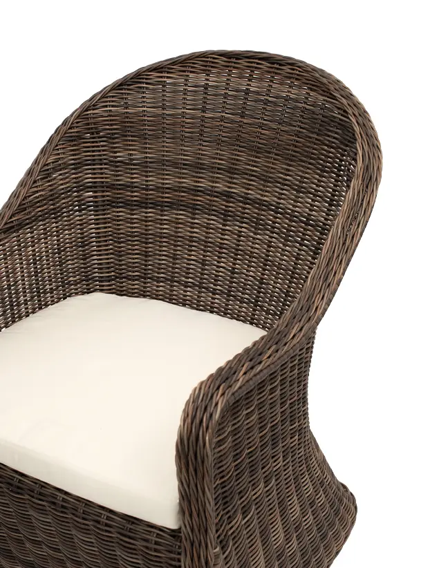 Esta sillón de ratán con cojín blanco es una excelente opción para eventos al aire libre o en espacios con un estilo rústico y acogedor. Su estructura tejida en tono oscuro aporta un toque elegante y natural, mientras que el asiento acolchonado brinda mayor comodidad. Ideal para recepciones, jardines o terrazas.