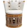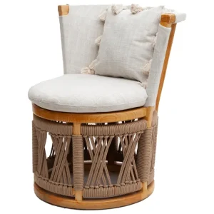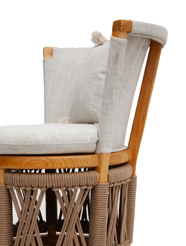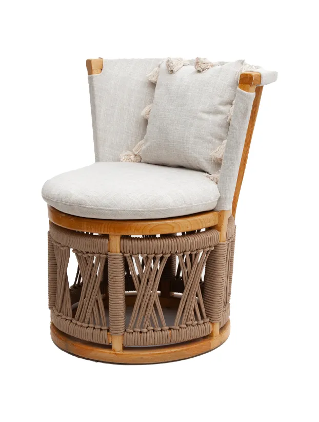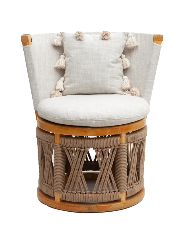 Este sillón estilo equipal con respaldo tapizado y cojinería decorativa combina la tradición artesanal con un diseño contemporáneo. Su base tejida en cuerda sobre estructura de madera le da un aire fresco y bohemio, ideal para zonas lounge o eventos con inspiración mexicana, tropical o relajada. Aporta calidez, textura y un toque distintivo al mobiliario del evento.