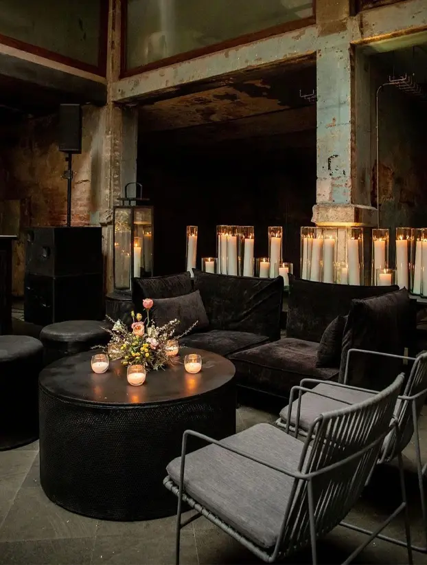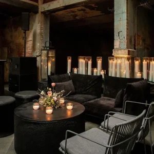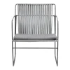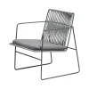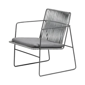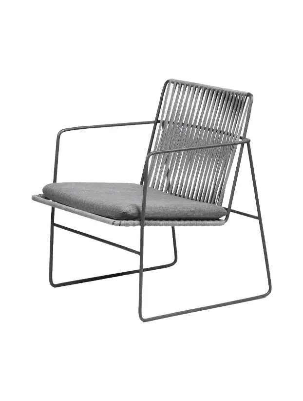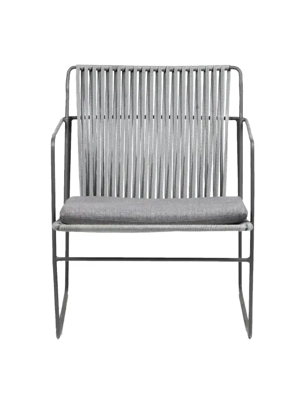 Este sillón de diseño moderno y minimalista tiene una estructura metálica en gris oscuro, con respaldo de cuerdas tensadas verticalmente que le da un aspecto ligero y contemporáneo. Los apoyabrazos también son de metal, siguiendo líneas limpias, mientras que el asiento incluye un cojín gris acolchado para mayor comodidad. La base inclinada hacia atrás mejora la postura de reclinación, siendo ideal para ambientes modernos tanto interiores como exteriores cubiertos, y adaptándose perfectamente a espacios minimalistas, industriales o contemporáneos.