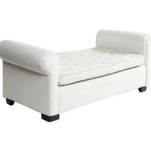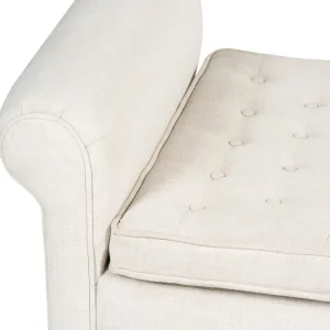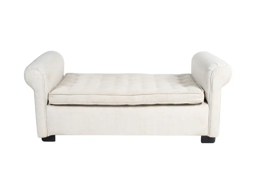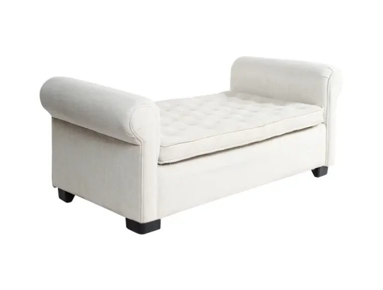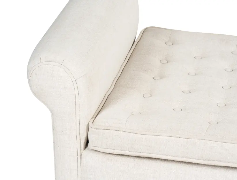 Este banco otomano en ivory negro combina un estilo clásico con un toque de elegancia moderna. Su asiento capitoné aporta una textura sofisticada, mientras que los reposabrazos enrollados con detalles de tachuelas metálicas añaden un acento decorativo refinado. La estructura robusta y sus patas de madera oscura completan el diseño, haciéndolo ideal para eventos que buscan una atmósfera distinguida y confortable.