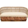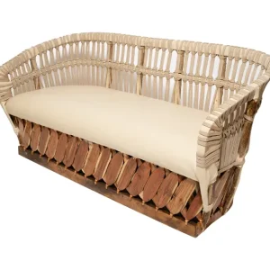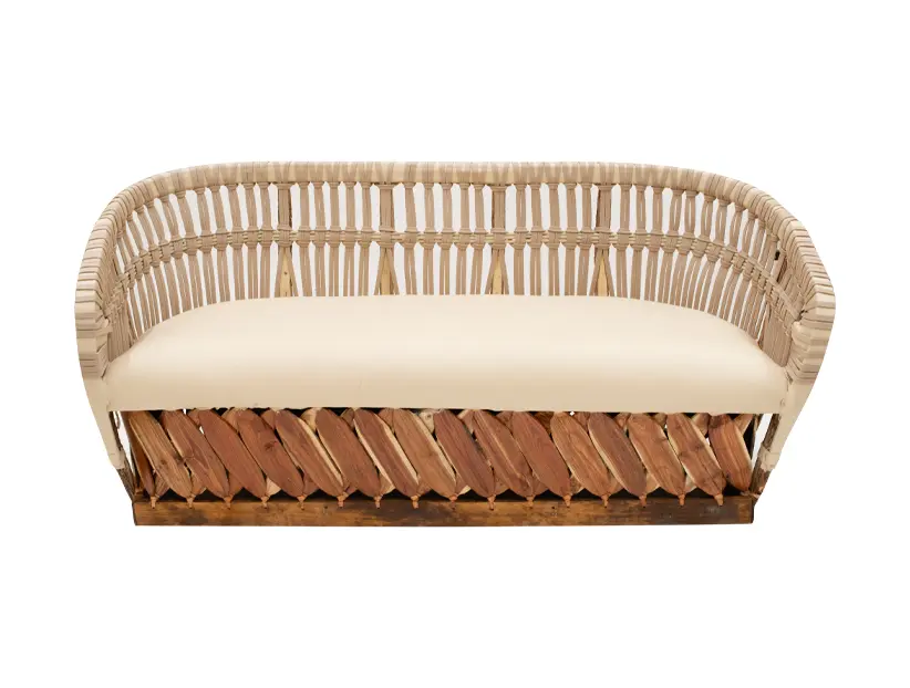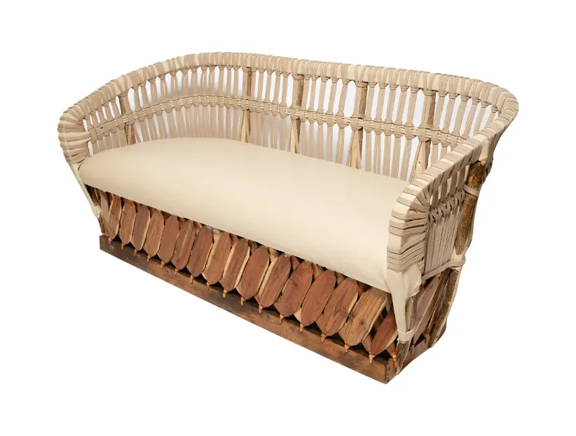 Este sofá estilo equipal destaca por su diseño artesanal, ideal para ambientes bohemios y rústicos. Fabricado con materiales naturales, presenta una estructura de madera y un entramado de cuerda que aporta una apariencia orgánica y relajada. Su asiento acolchado en tono beige añade comodidad, y su construcción abierta permite una ventilación óptima, haciéndolo perfecto para espacios exteriores o interiores con un estilo natural. Este sofá es ideal para eventos que buscan una decoración auténtica y con un toque cultural mexicano.
