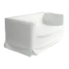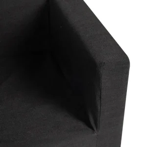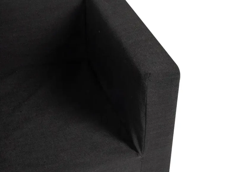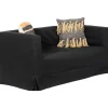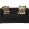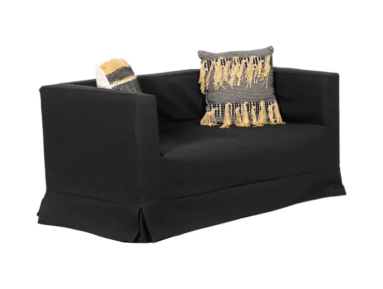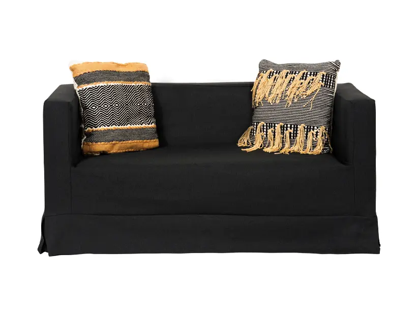 Este sofá en color negro tiene un diseño moderno y funcional con líneas rectas y un faldón que le da un toque elegante y contemporáneo. Los cojines decorativos con detalles en tonos beige y texturas variadas añaden un contraste visual atractivo y un toque bohemio. Este mueble es ideal para eventos que buscan una combinación de estilo sofisticado y acogedor, ofreciendo un asiento cómodo y versátil que complementa decoraciones modernas y minimalistas.