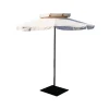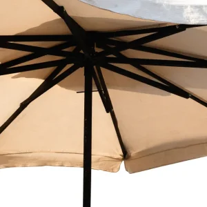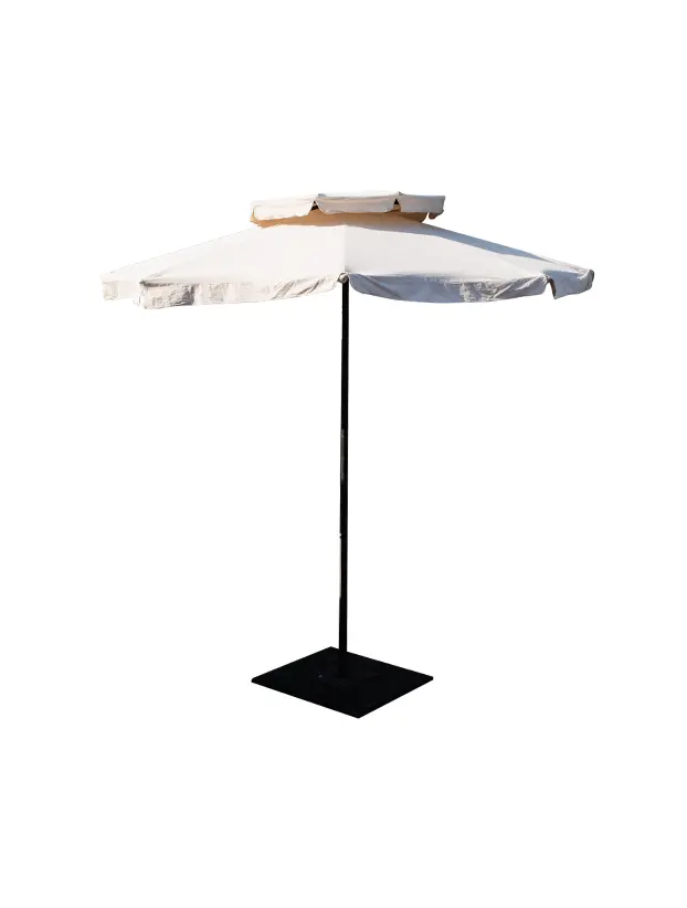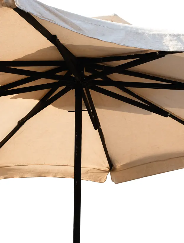 Sombrilla de diseño clásico con estructura metálica negra y cubierta en tela beige, que combina funcionalidad y estilo para eventos al aire libre. Su base robusta garantiza estabilidad, mientras que su doble capa en la parte superior proporciona mayor ventilación y frescura. Ideal para crear áreas sombreadas en bodas, reuniones o celebraciones en exteriores.