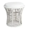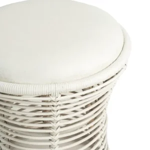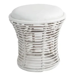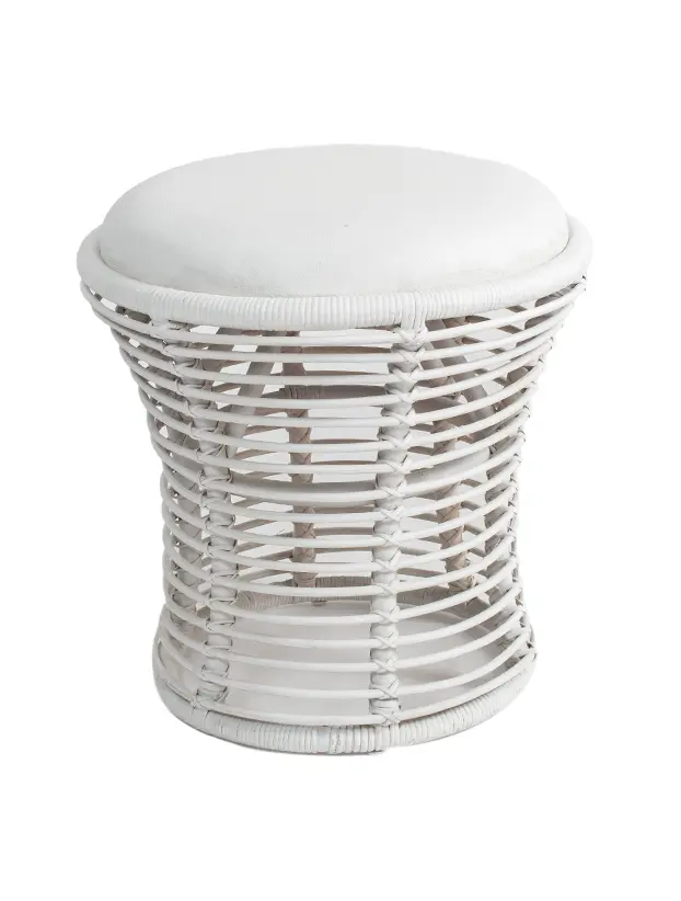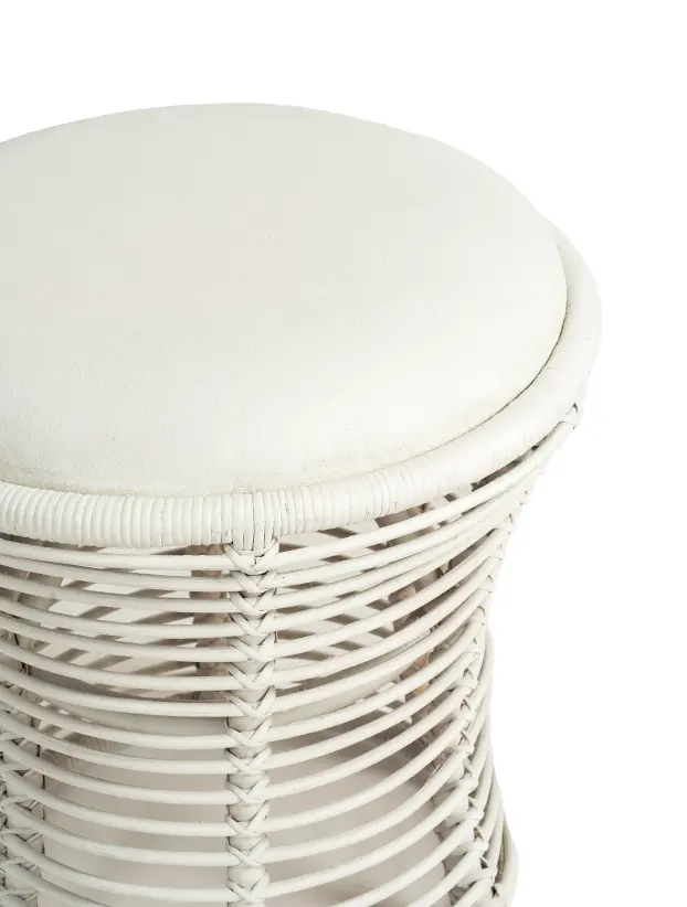 Taburete de ratán con diseño abierto y cojín superior en color blanco, ideal para renta en eventos de estilo bohemio o natural. Su estructura tejida y su asiento acolchado ofrecen comodidad y un toque decorativo único, perfecto para áreas de lounge o espacios de descanso en ambientes al aire libre o interiores con temática tropical. Este taburete combina ligereza visual y funcionalidad, aportando un toque cálido y acogedor.