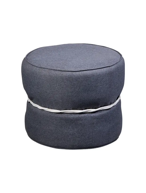 Taburete redondo en color gris con diseño tipo «pata de elefante» y detalle de cordón decorativo en el centro, ideal para renta en eventos que buscan un estilo casual y cómodo. Su forma robusta y tapizado suave lo convierten en una excelente opción para áreas de lounge o como asiento adicional en decoraciones relajadas y modernas. Este taburete aporta un toque contemporáneo y acogedor a cualquier espacio.