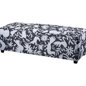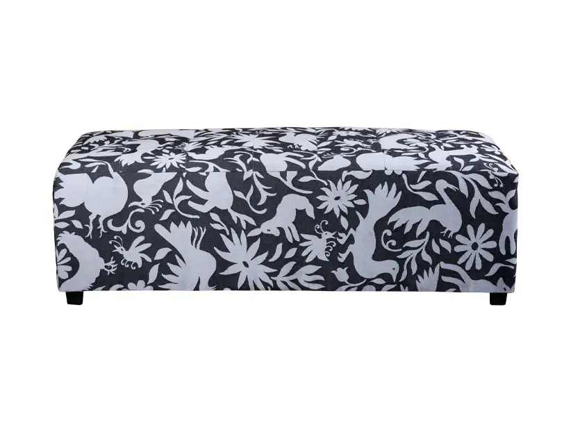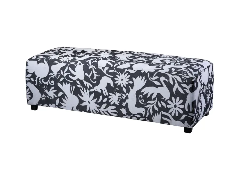 Este taburete rectangular está tapizado con un diseño inspirado en los bordados otomíes, mostrando patrones en blanco y negro con figuras de animales y plantas, característicos del arte tradicional mexicano. Su forma alargada y acolchada ofrece comodidad y espacio suficiente para múltiples personas, lo que lo hace ideal para áreas de descanso en eventos o para decorar espacios con un toque cultural. Este taburete es perfecto para ambientes bohemios, étnicos o que busquen destacar elementos de la cultura mexicana, aportando un acento visual vibrante y lleno de identidad cultural.