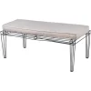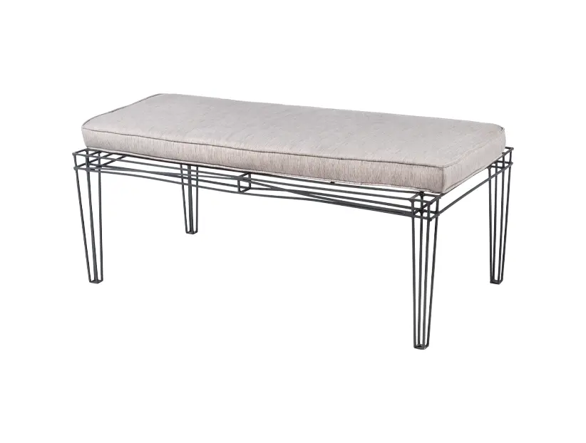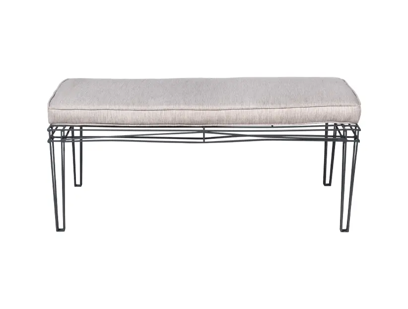 Taburete alargado con estructura de metal en diseño geométrico y cojín superior en color gris claro, ideal para renta en eventos que buscan un estilo moderno y elegante. Su base abierta y líneas minimalistas le dan un aspecto ligero y sofisticado, perfecto para áreas de lounge o como asiento adicional en decoraciones contemporáneas. Este taburete es una opción versátil que combina funcionalidad con un diseño innovador, adaptándose bien a ambientes industriales o de inspiración moderna.