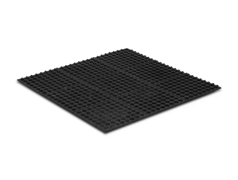 Este es un tapete anti-fatiga de goma, ideal para proporcionar comodidad en áreas donde se permanece de pie durante largos períodos, como cocinas, estaciones de trabajo o eventos. Su diseño cuenta con perforaciones que permiten la ventilación y evitan la acumulación de líquidos, además de asegurar un agarre óptimo para prevenir resbalones. Su estructura es duradera y resistente, ofreciendo soporte y absorción de impacto, lo que ayuda a reducir la fatiga en piernas y pies.
