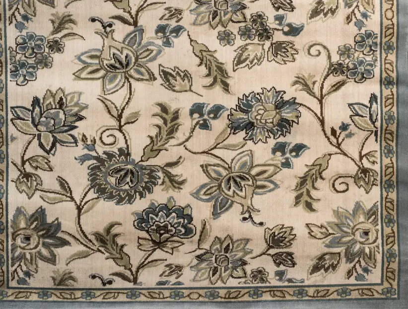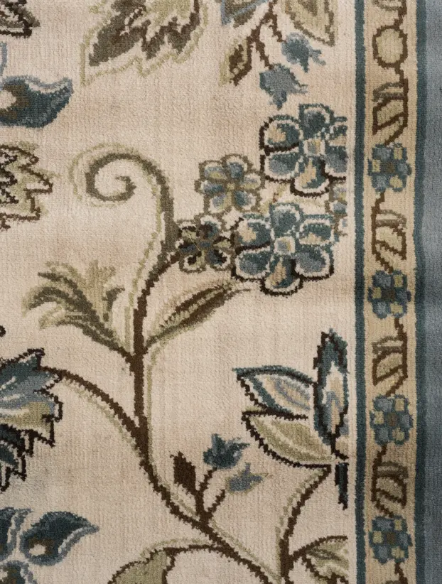 El tapete persa en tono ivory presenta un diseño elegante y delicado con un fondo claro que resalta sus intrincados patrones florales en tonos azulados, verdes y grises. Este tapete es ideal para añadir un toque de sofisticación y calidez a cualquier espacio, gracias a sus detalles clásicos y su color neutro que facilita su combinación con distintos estilos de decoración. La orilla tiene un borde decorado que enmarca el diseño principal, lo que le da un acabado armonioso y refinado. Perfecto para eventos o ambientes que buscan un estilo clásico y atemporal.