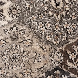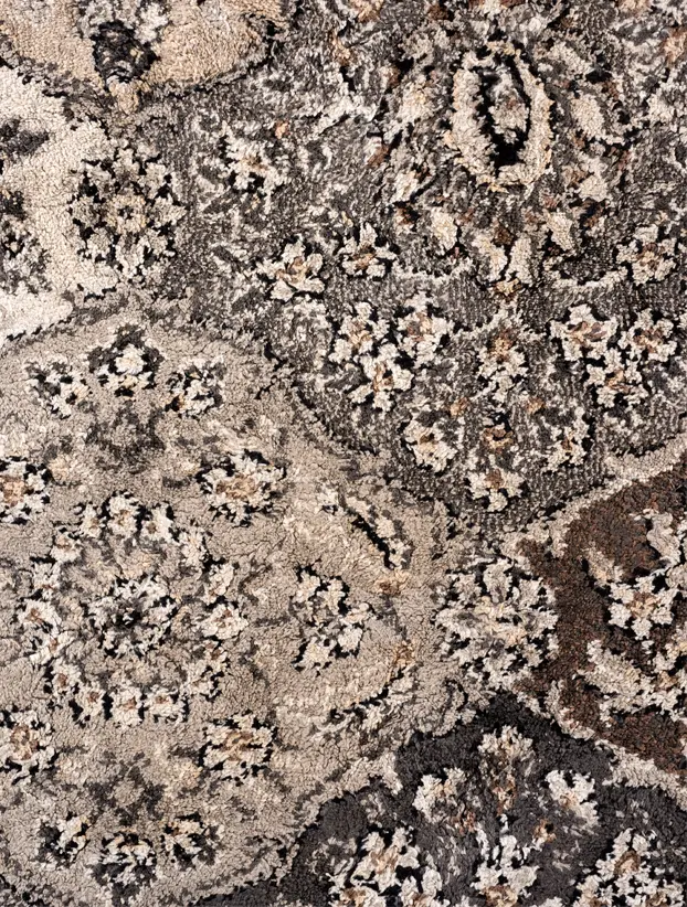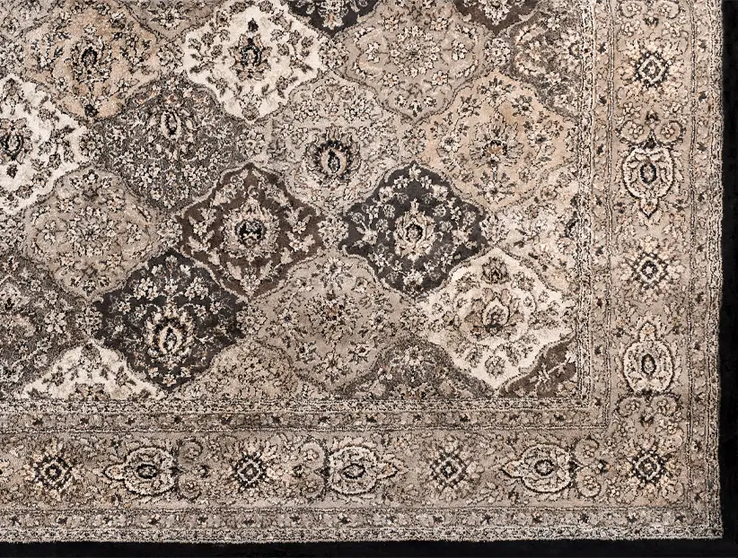 Este tapete persa en tonos neutros presenta un diseño clásico con motivos ornamentales en forma de diamantes y detalles florales. Los colores predominantes incluyen una mezcla de grises, beige, y negro, que le brindan un aspecto sofisticado y versátil. Su patrón detallado enmarcado por un borde decorativo añade un toque elegante y atemporal, ideal para complementar decoraciones tanto modernas como tradicionales. Es perfecto para agregar calidez y estilo a espacios interiores, proporcionando una base decorativa rica en textura y detalles.
