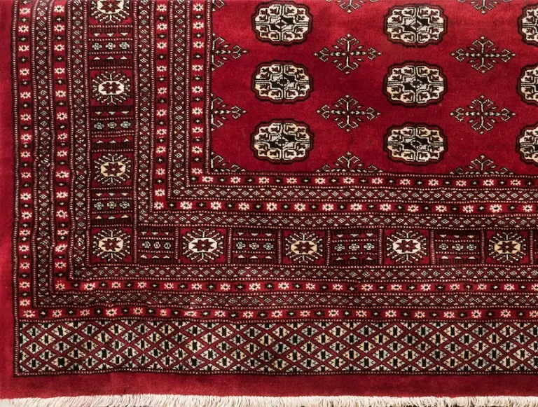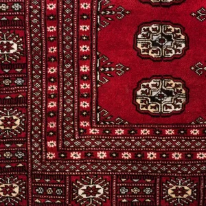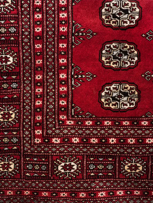 El tapete Persa Rojo presenta un diseño tradicional con un vibrante fondo rojo, adornado con patrones geométricos y florales en tonos crema, negro y marrón. Su borde detallado está compuesto de múltiples franjas con intricados motivos que realzan su elegancia clásica. Este tapete evoca un estilo oriental auténtico, ideal para añadir un toque de sofisticación y calidez a cualquier espacio.