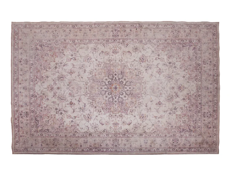 Esta alfombra estilo oriental es una pieza elegante y atemporal, ideal para complementar montajes de eventos con un toque clásico y refinado. Su diseño presenta un patrón floral y arabesco simétrico en tonos suaves de lila, lavanda y beige, creando una atmósfera cálida y romántica sin sobrecargar el espacio. El desgaste intencional en el acabado le otorga un carácter vintage, perfecto para ceremonias íntimas, zonas lounge o como base decorativa en mesas de novios o salas de estar dentro de bodas y eventos sociales. Su paleta neutra permite armonizar fácilmente con distintos estilos de mobiliario y florales.