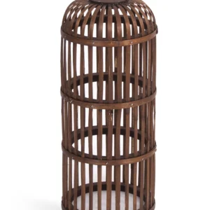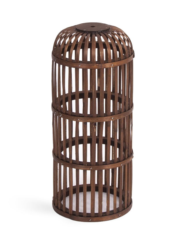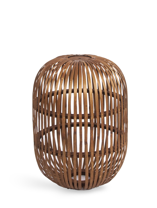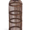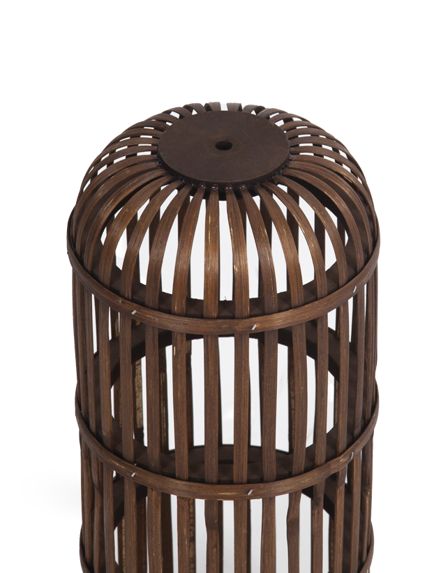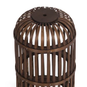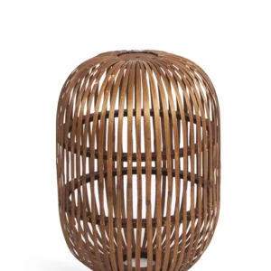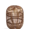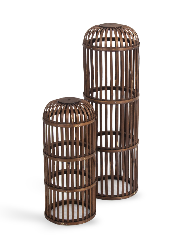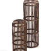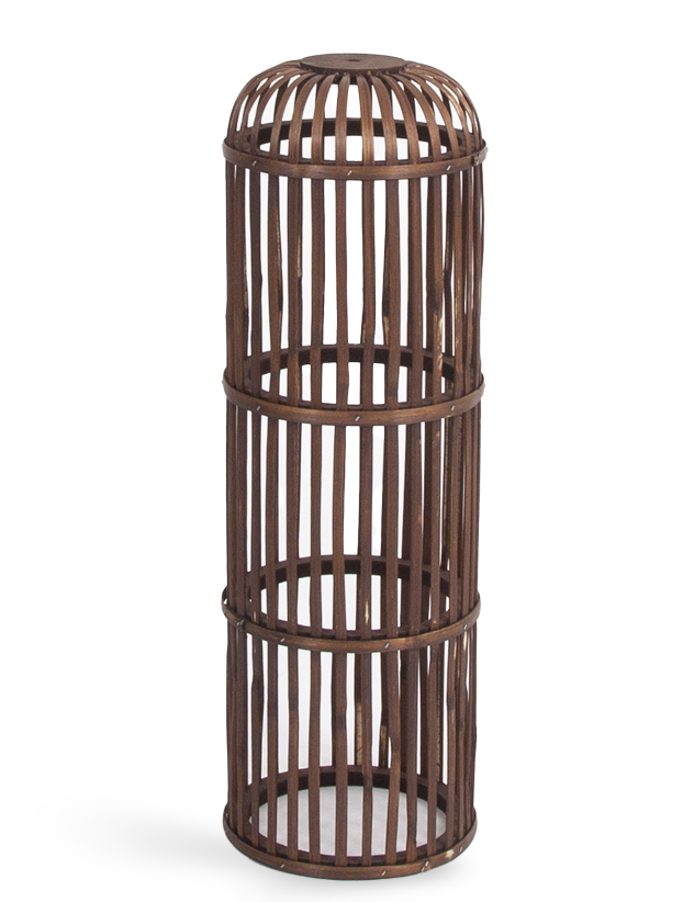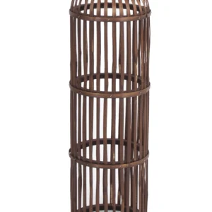 Tótem decorativas de piso con diseño cilíndrico y remate superior tipo cúpula, elaboradas carrizo con varillas verticales que forman una estructura abierta y estilizada; su acabado natural aporta calidez y un carácter artesanal, generando una iluminación ambiental suave y un acento vertical ideal para ambientaciones orgánicas, bohemias o contemporáneas.