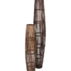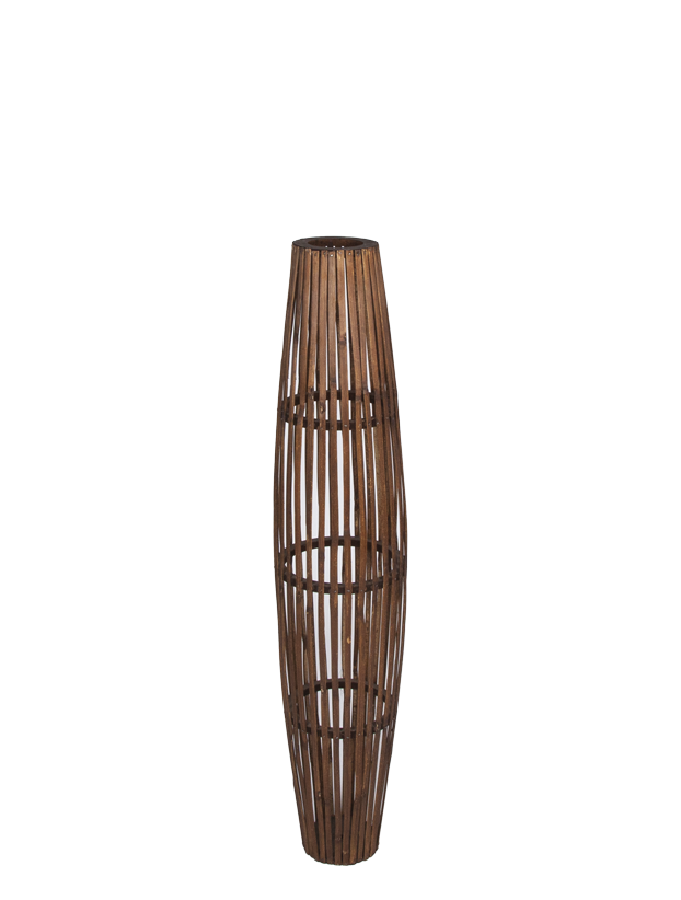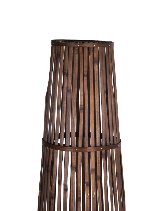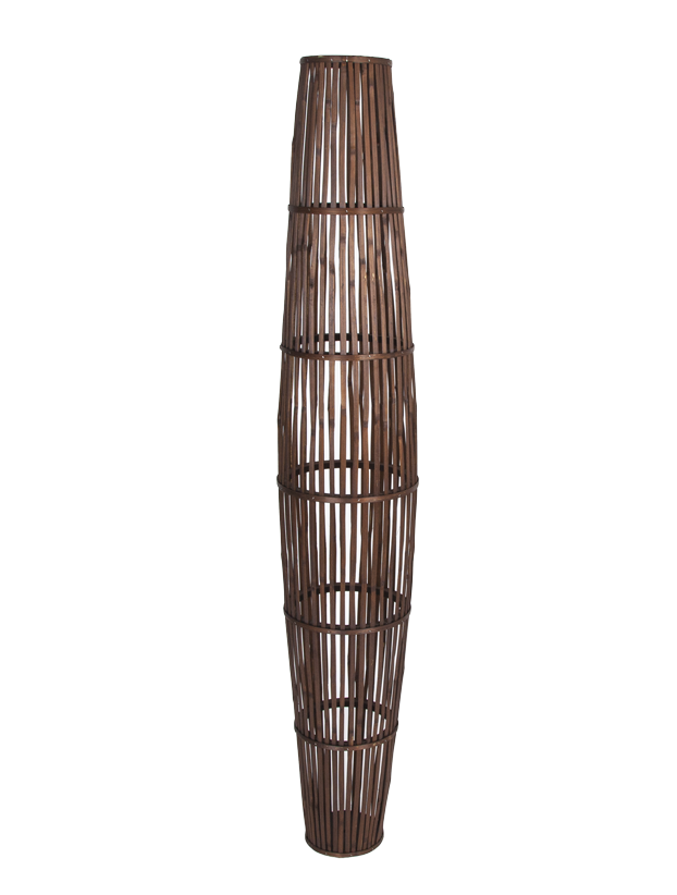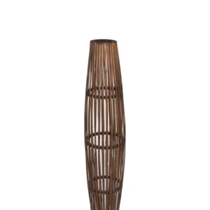 Totem decorativo de piso con diseño estilizado en carrizo, formadas por varillas verticales que crean una estructura abierta y ligera; su acabado natural y silueta orgánica aportan calidez, altura y un efecto de luz ambiental suave, ideales para complementar espacios con una estética natural, bohemia o contemporánea.