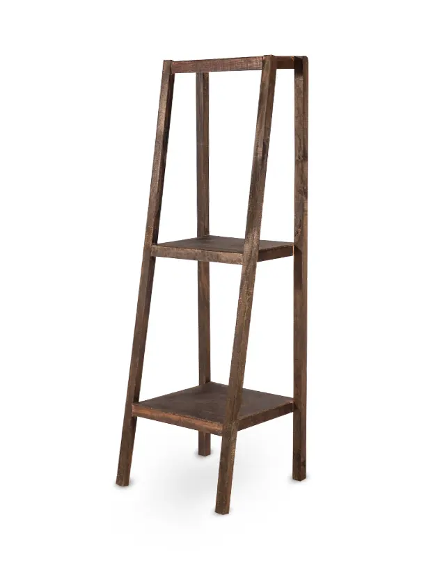 Esta es una estantería de madera en forma de escalera, con un diseño rústico y robusto, perfecta para eventos que buscan una estética natural o vintage. Su estructura incluye dos niveles de estantes, ideales para exhibir productos, decoración o elementos promocionales. La madera oscura le da un toque cálido y elegante, y su diseño inclinado aporta estabilidad y estilo.